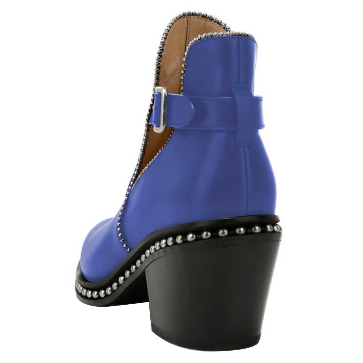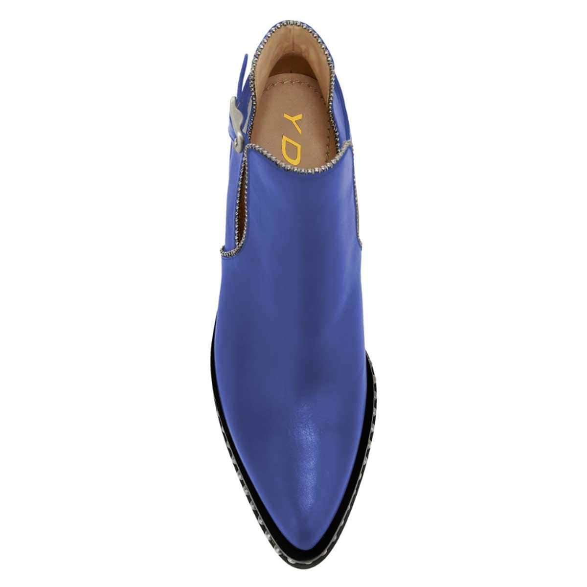 Blue Chunky Heel Studded Buckle Strap Pointed Toe Booties for Women