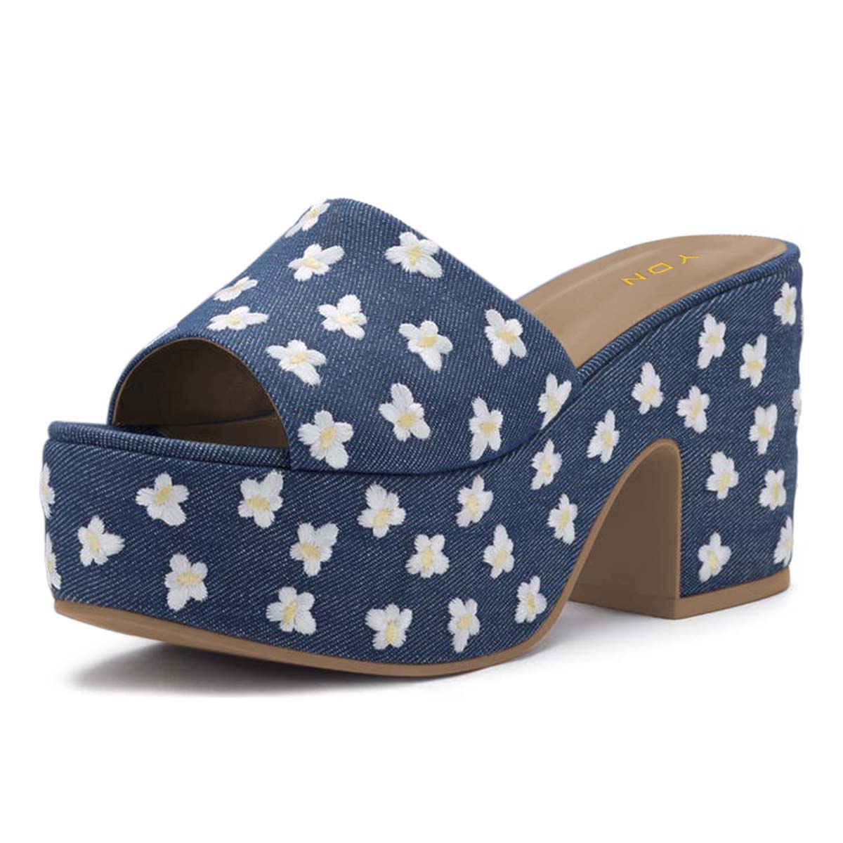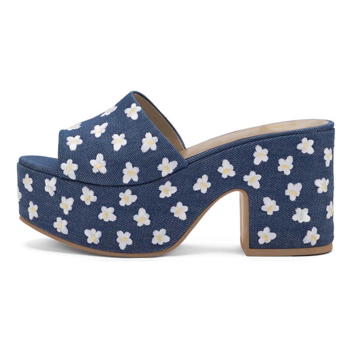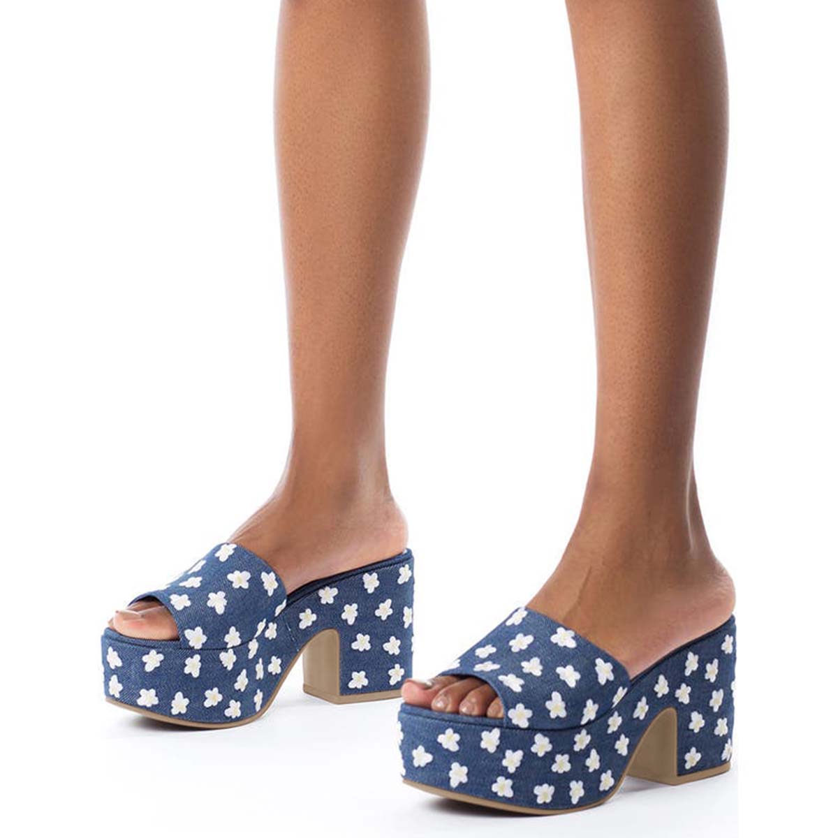 Blue Denim Open Toe Mules White Flower Embroidery Platform Sandals