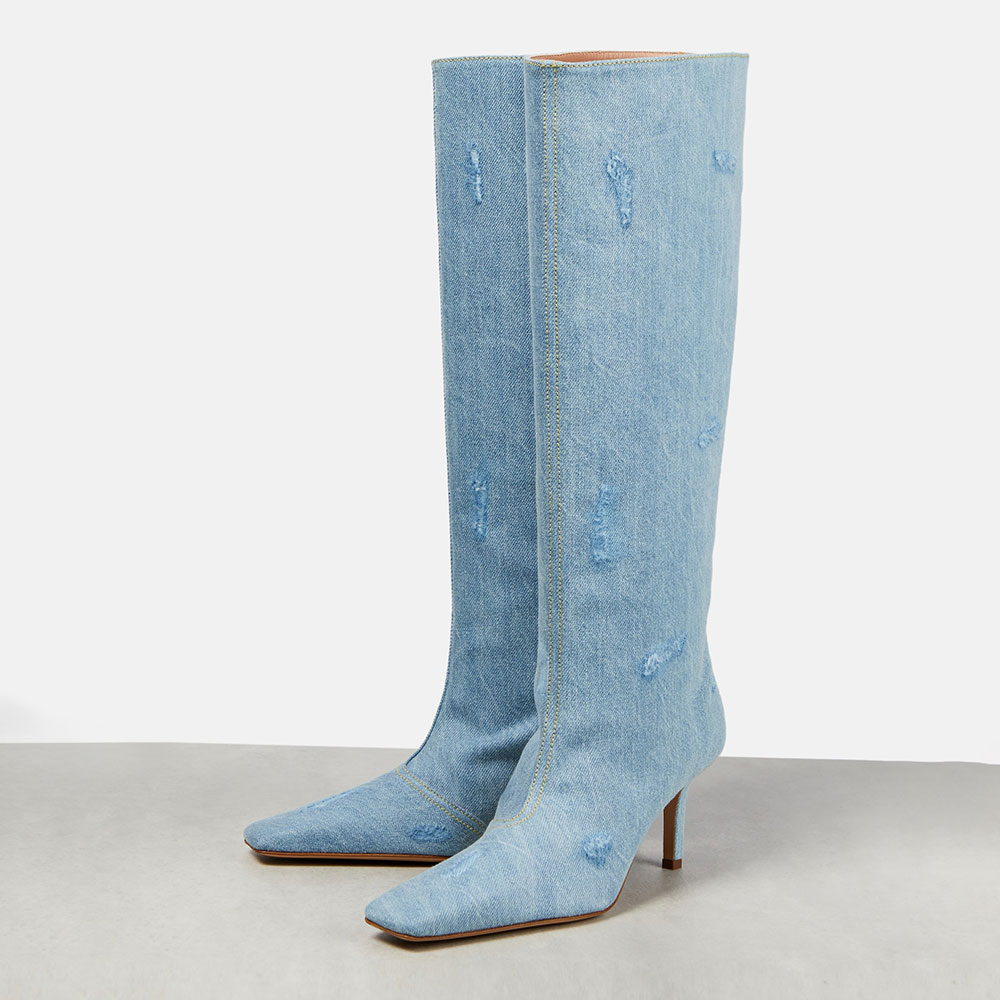 Blue Denim Square Toe Stiletto Heel Distressed Knee High Boots