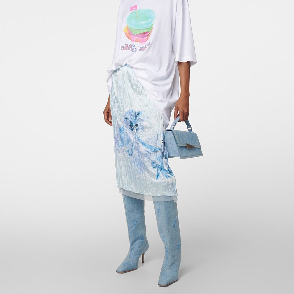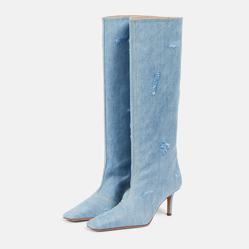 Special Designs: This blue denim knee-high boots feature a distressed design, a square toe, and stiletto heels.