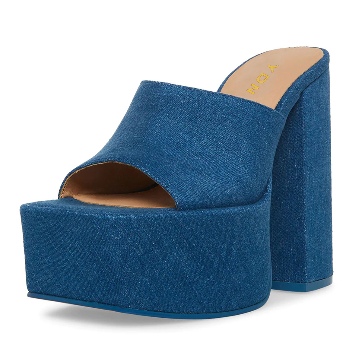 Blue Denim Square Toe Wide Band Platform Mules with Block Heel