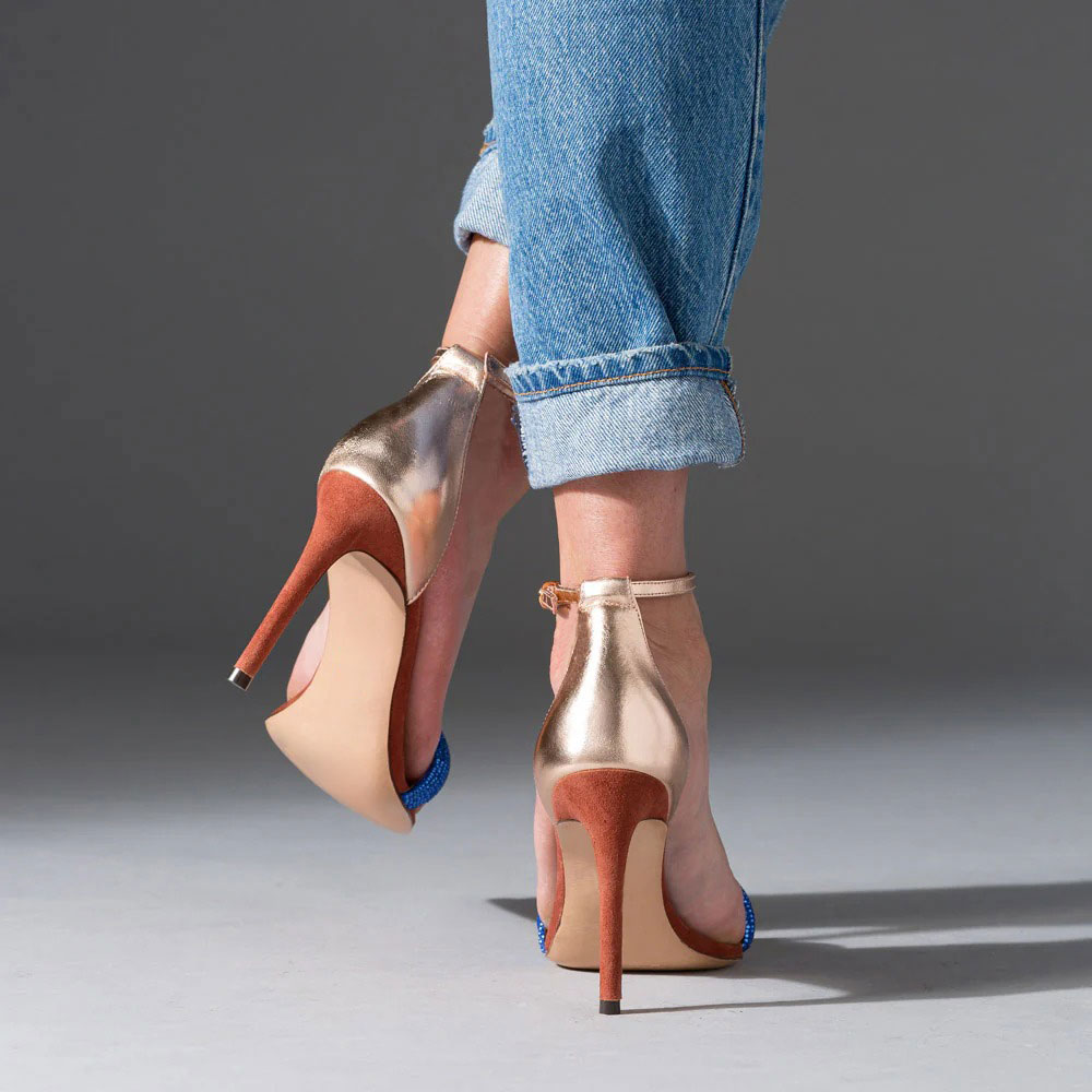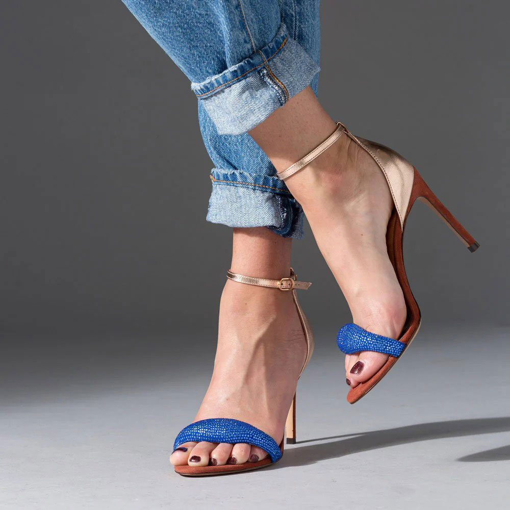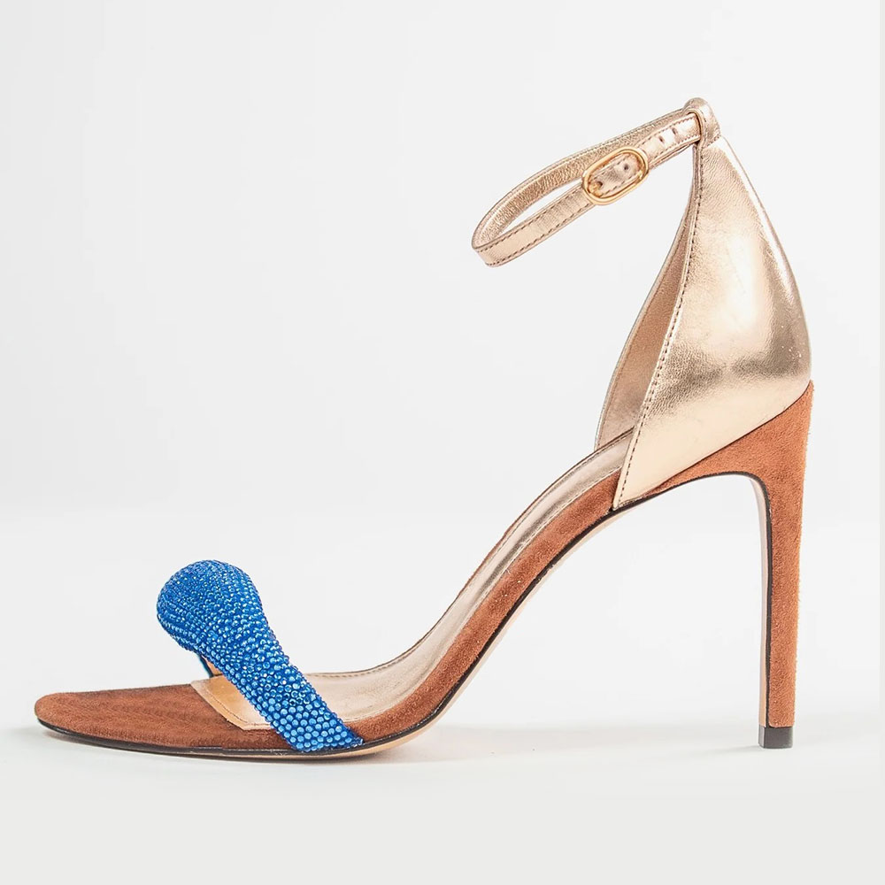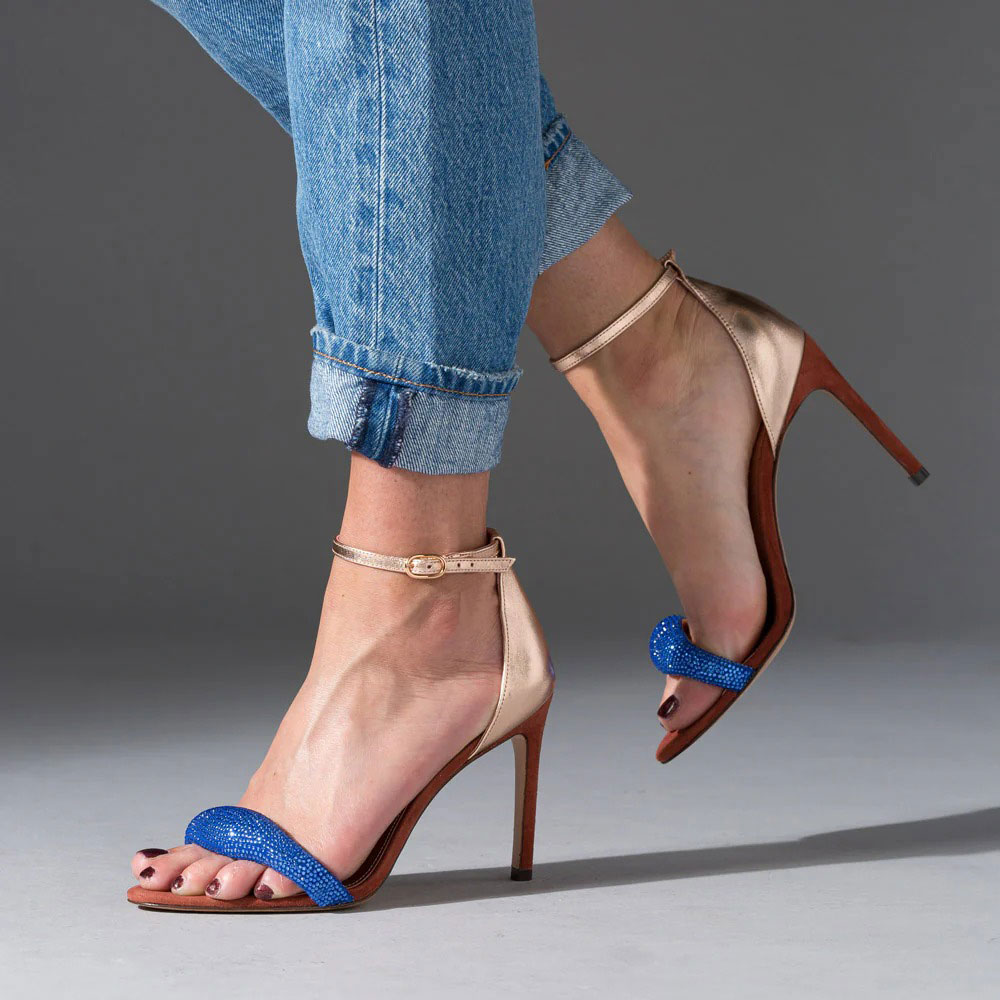 Blue & Gold Rhinestone Stiletto High Heel Ankle Strap Women Sandals