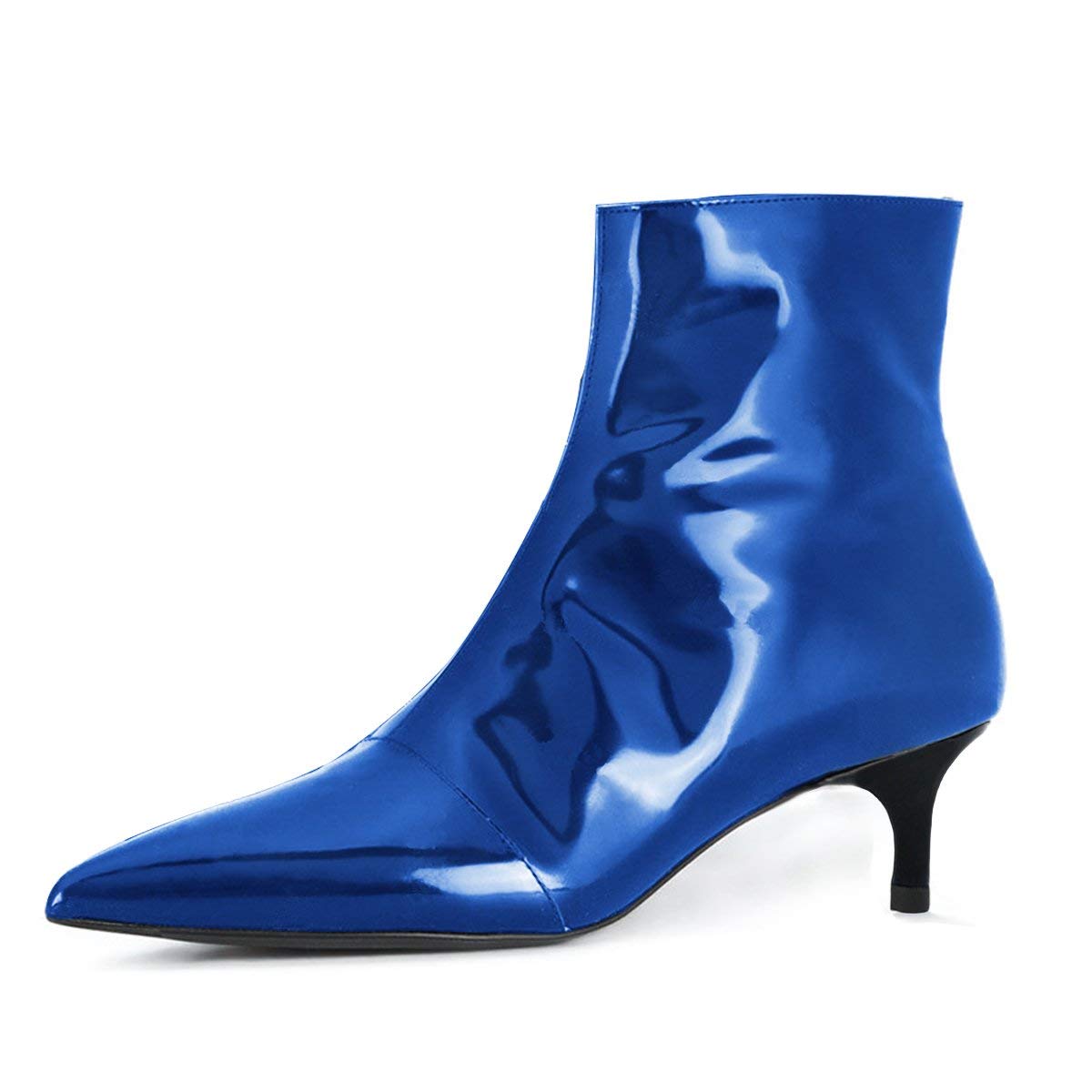 Blue Patent Leather Pointed Toe Kitten Heel Booties for Women