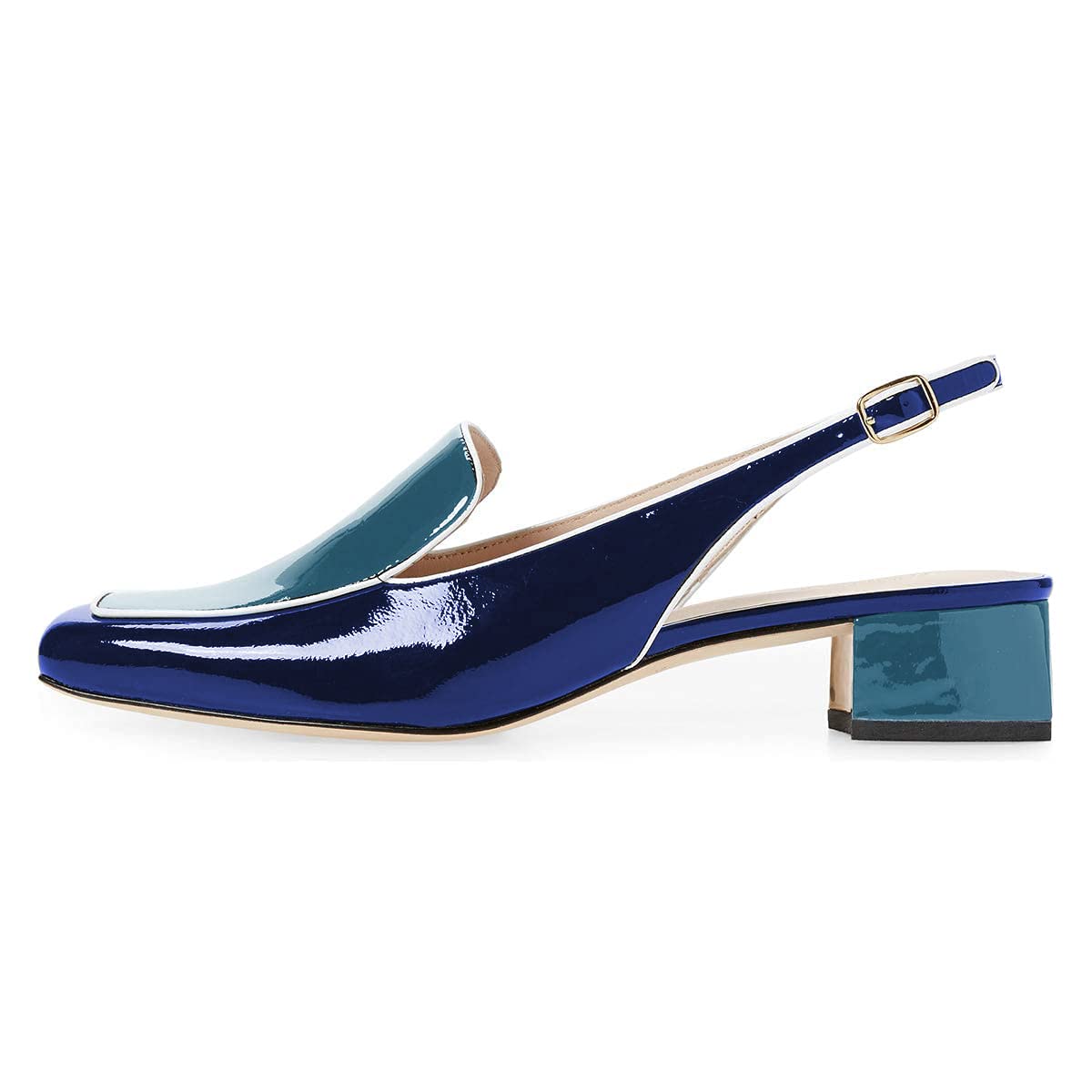 Blue Patent Leather Square-Toe Slingback Loafers with Chunky Heels