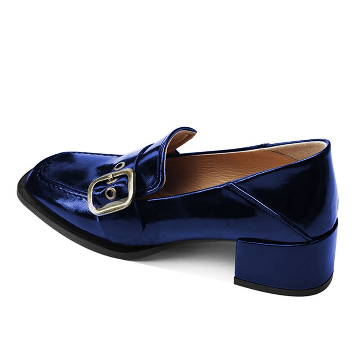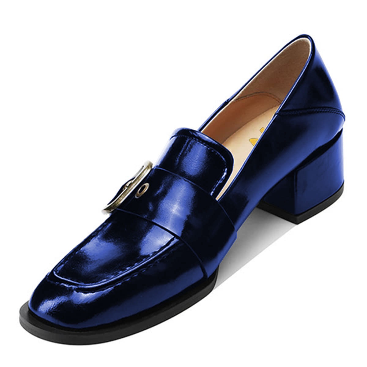 Blue Square Toe Chunky Heel Grommet Loafer Shoes Women with Buckle