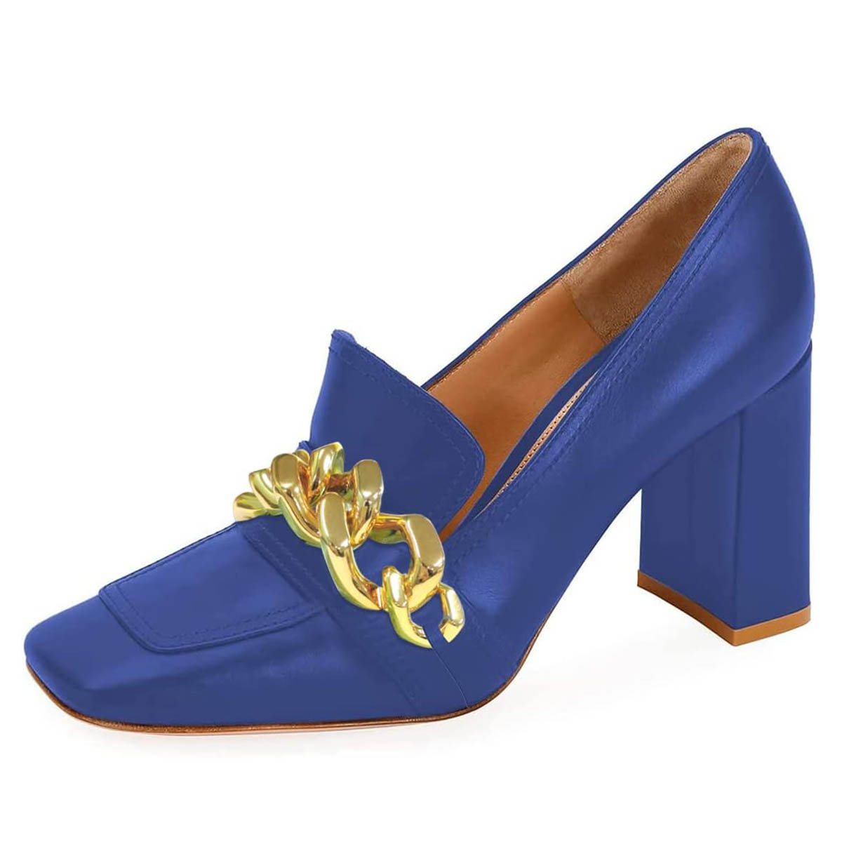 Blue Square Toe Chunky Heel Women's Loafers with Gold Chain