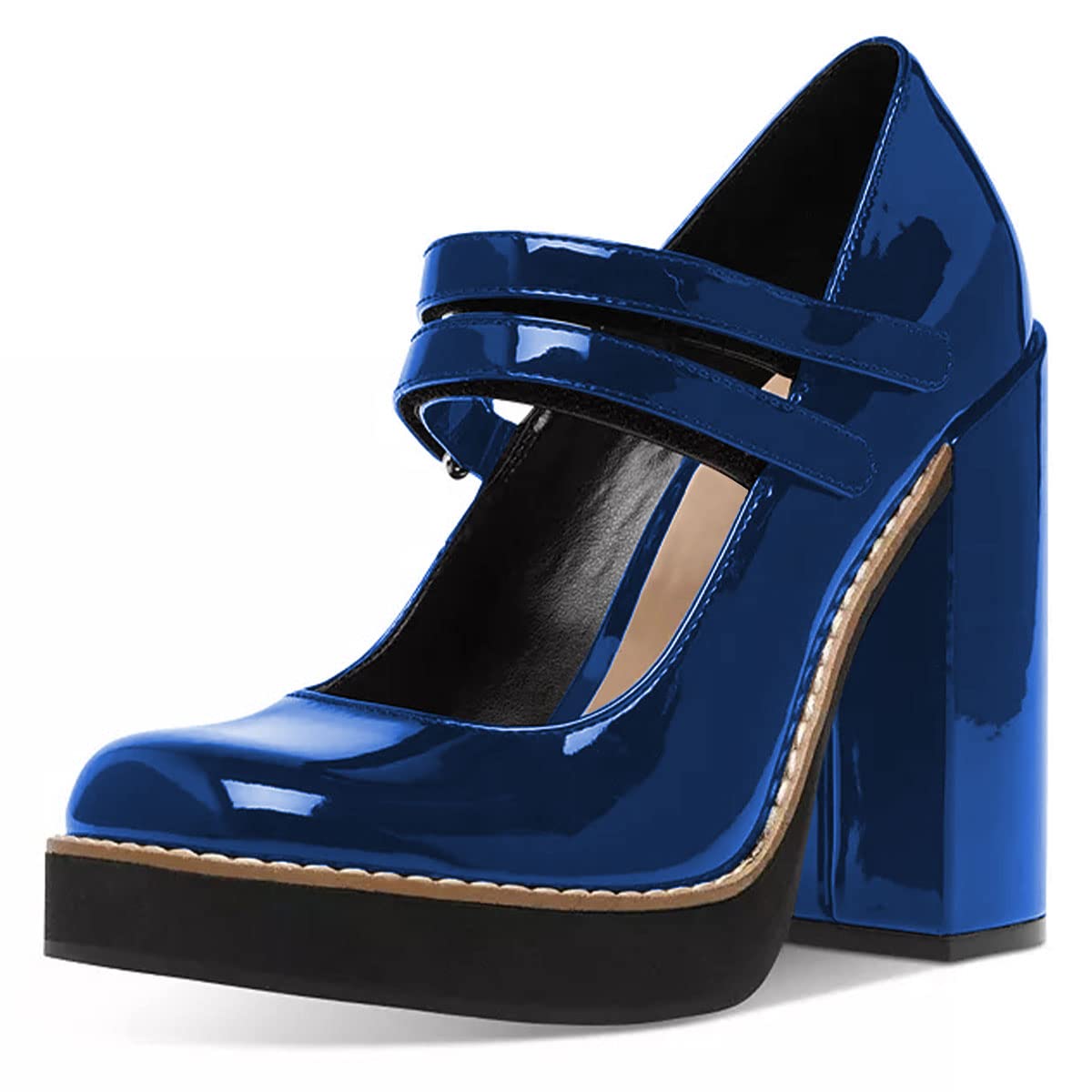 • Special Designs: Navy Mary Jane platform shoes with a classic block heel and an adjustable double strap design.