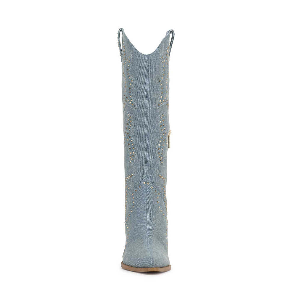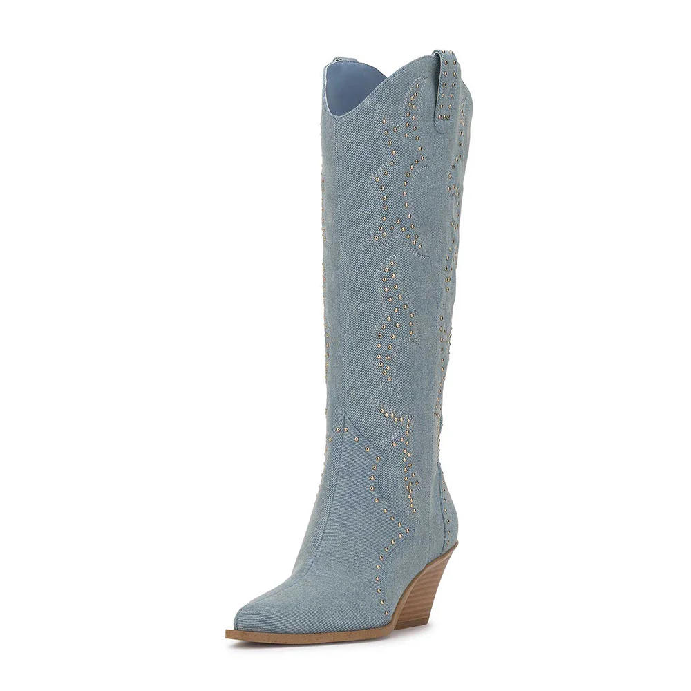 Blue Studded Embroidered Patchwork Pointed Toe Denim Cowboy Boots