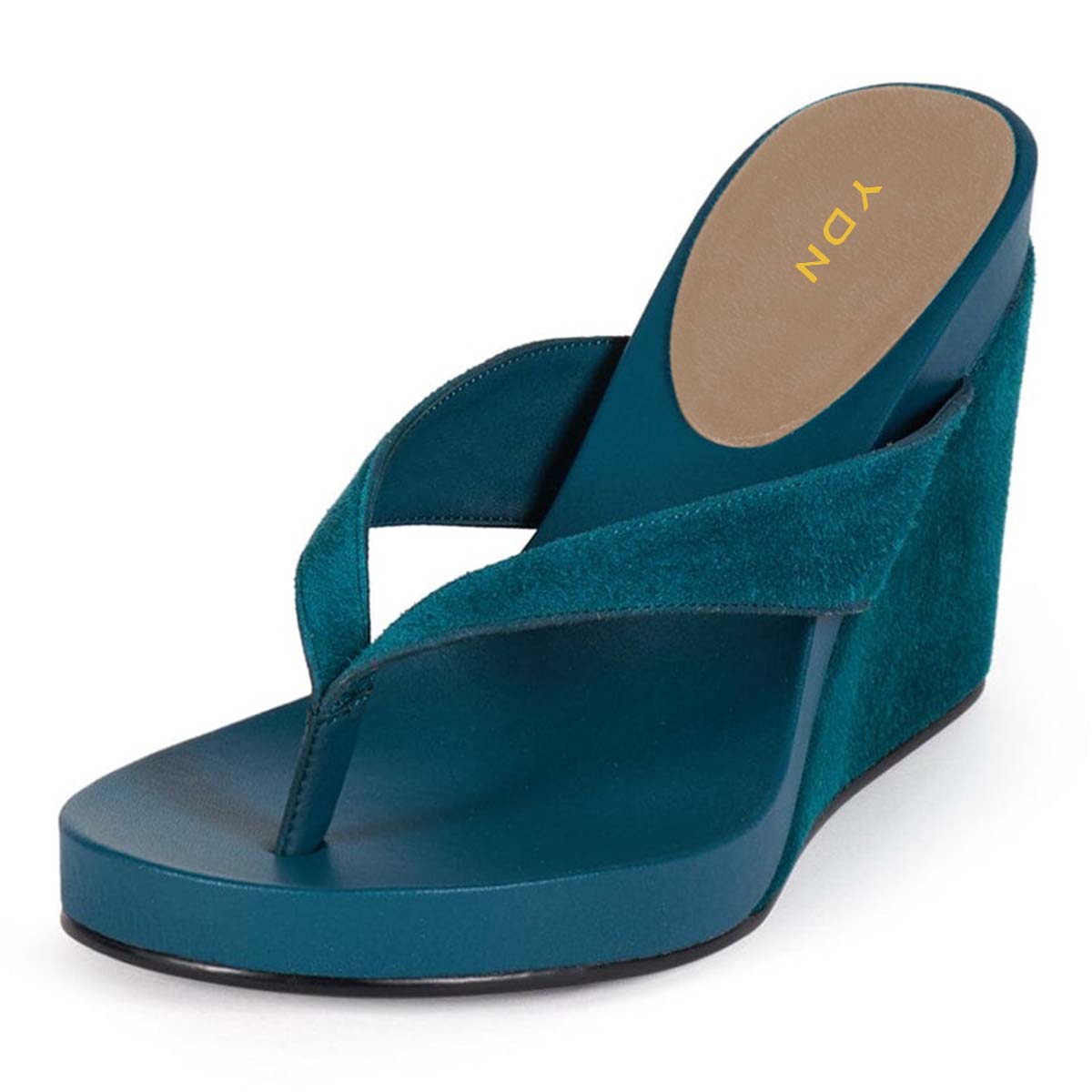 Blue Vegan Suede Open Round Toe Wedge Heeled Sandals with Platform