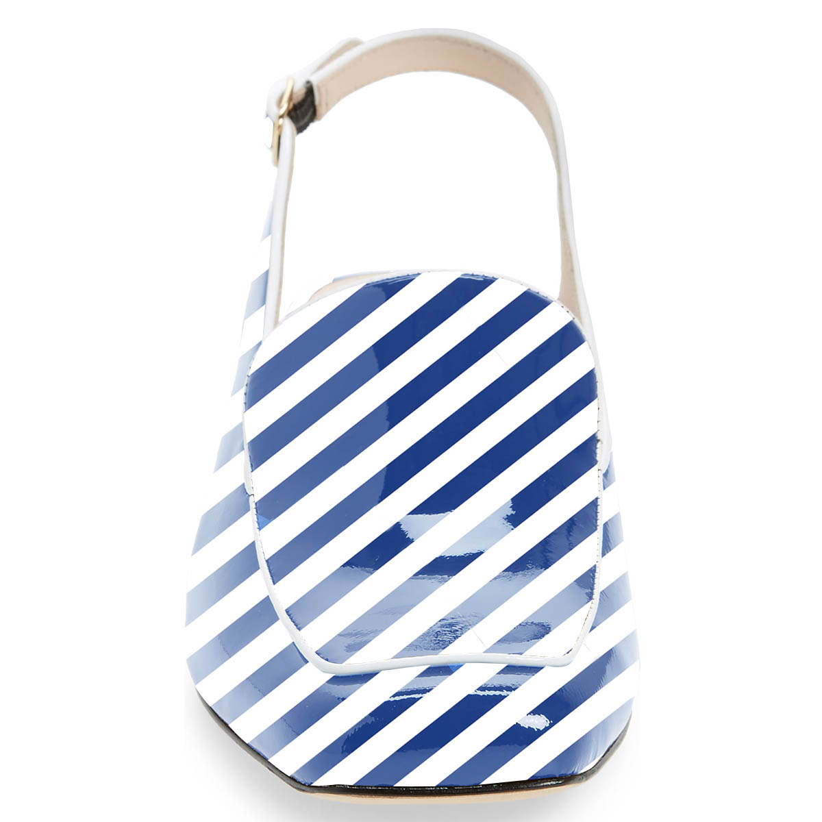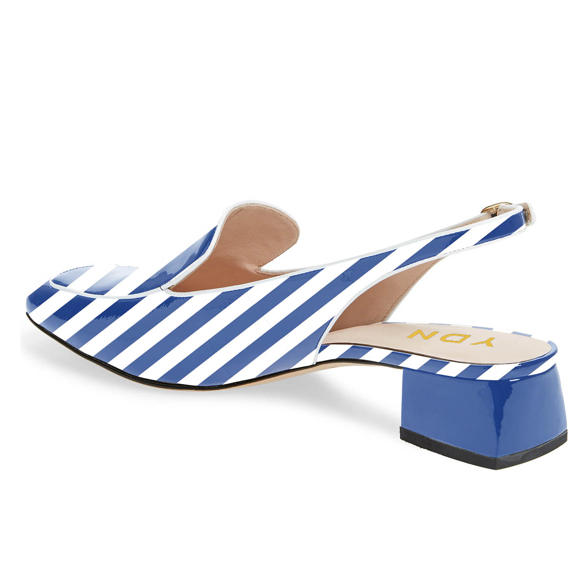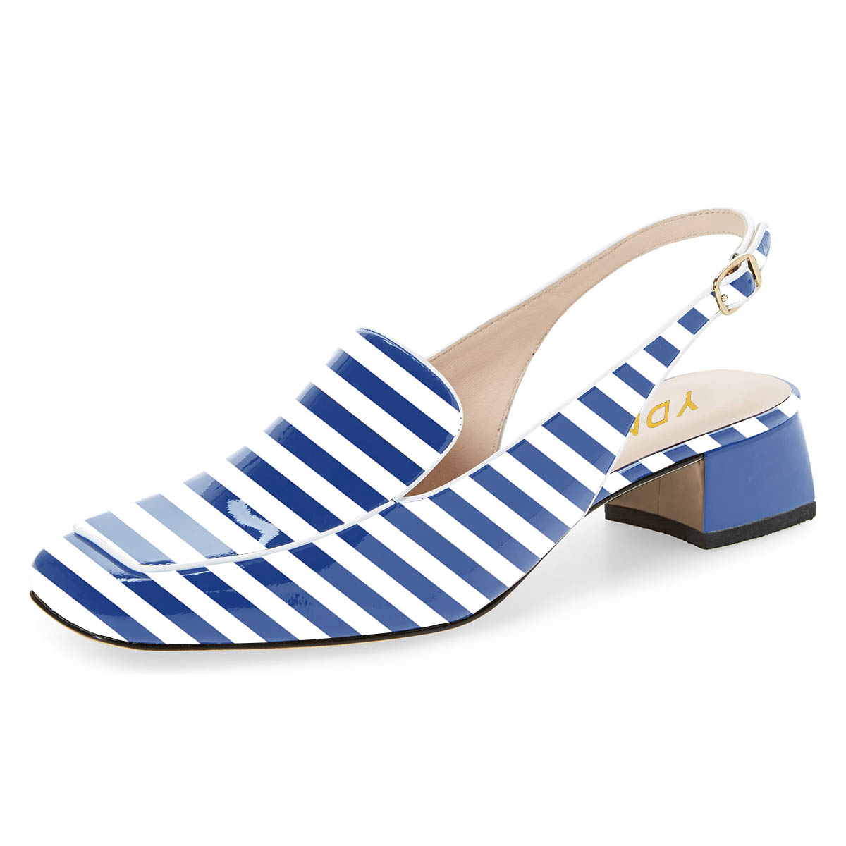 • Special Designs: The square-toe slingback loafers feature chunky low heels and a blue and white stripe design.