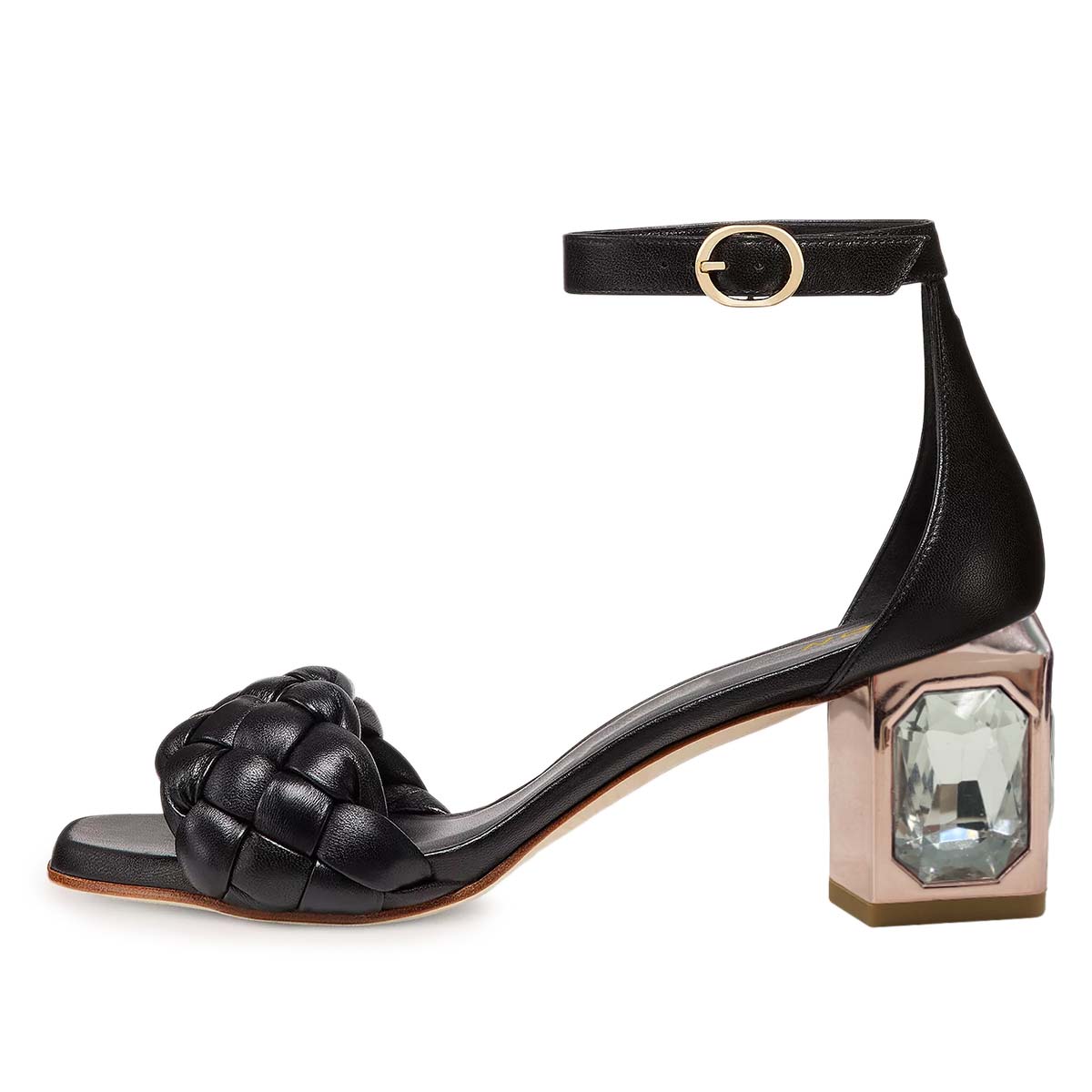 Braided Open-Toe Rhinestone Chunky Heel Black Sandals for Women