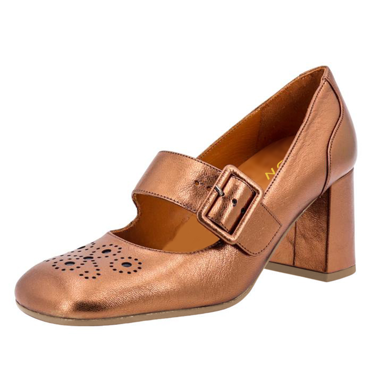 Special Designs: Bronze Mary Janes with a classic block heel and an adjustable strap design.