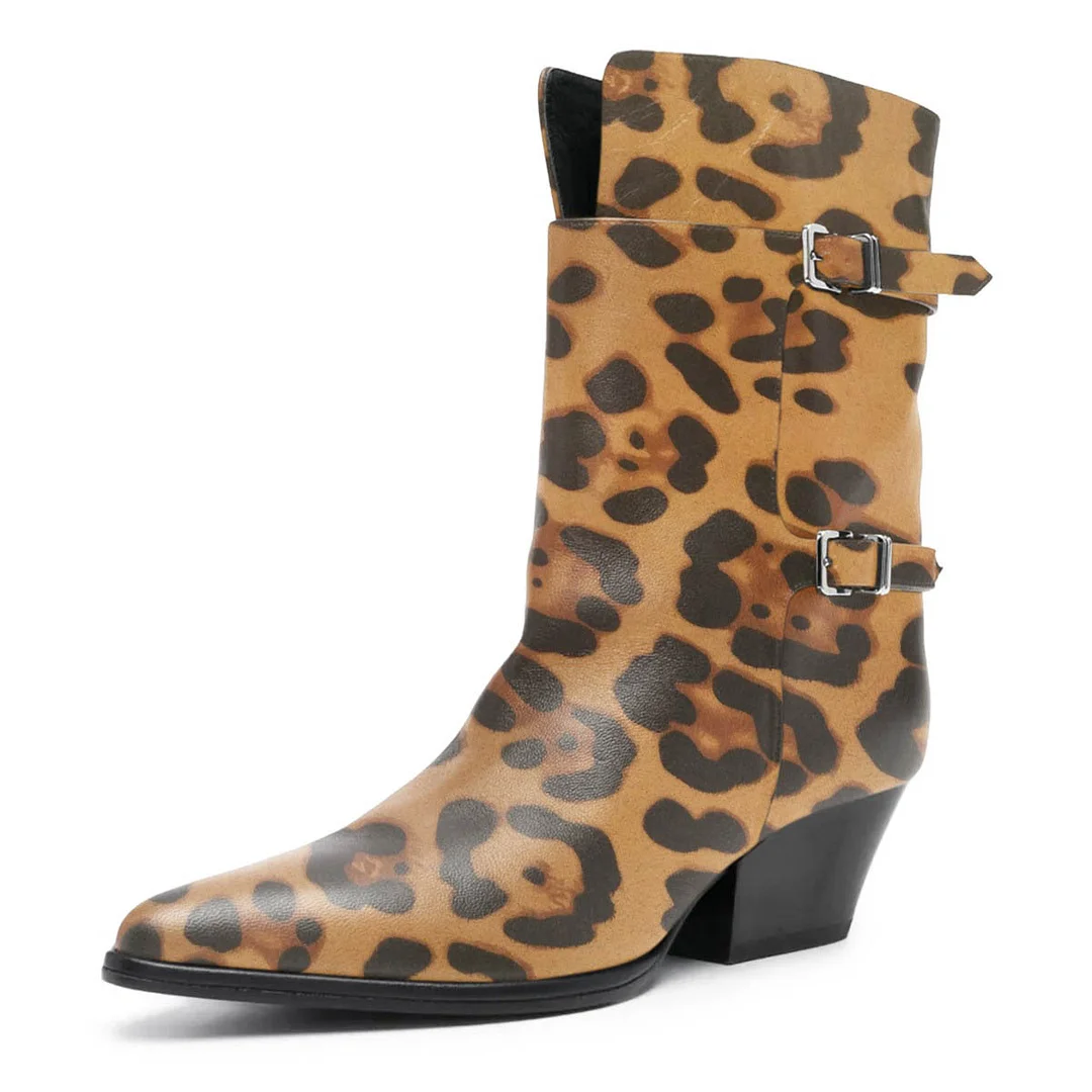 • Special Designs: The brown and black ankle boots feature a pointed toe, chunky heel, bold leopard print, and two silver buckled straps for a stylish finish.