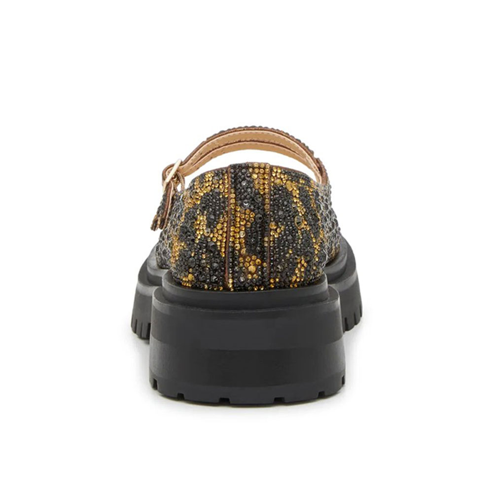 Special Designs: The Mary Jane feature a dazzling leopard-print design covered in rhinestones, double Mary Jane straps with buckles, and a platform.