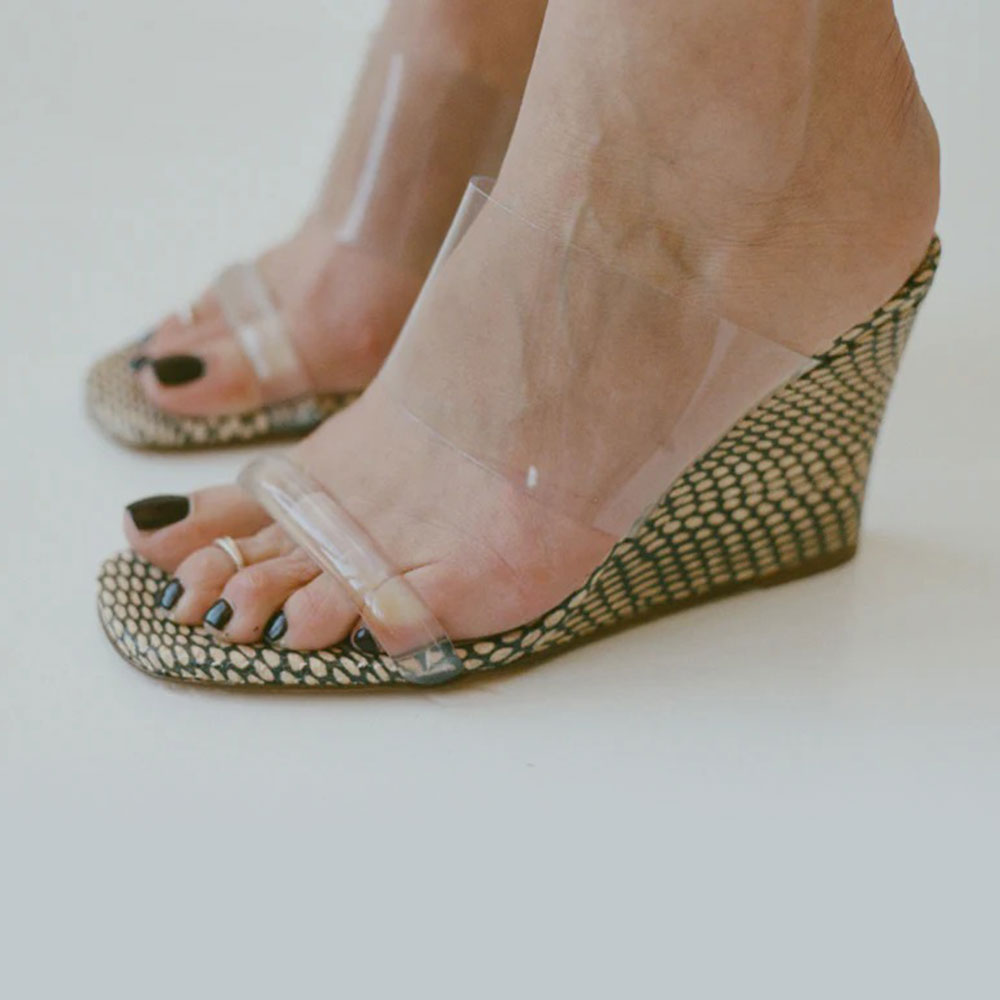 • Special Designs: The brown and black mules feature a wedge heel and square toe, a snakeskin print, and have transparent straps for a minimalist.