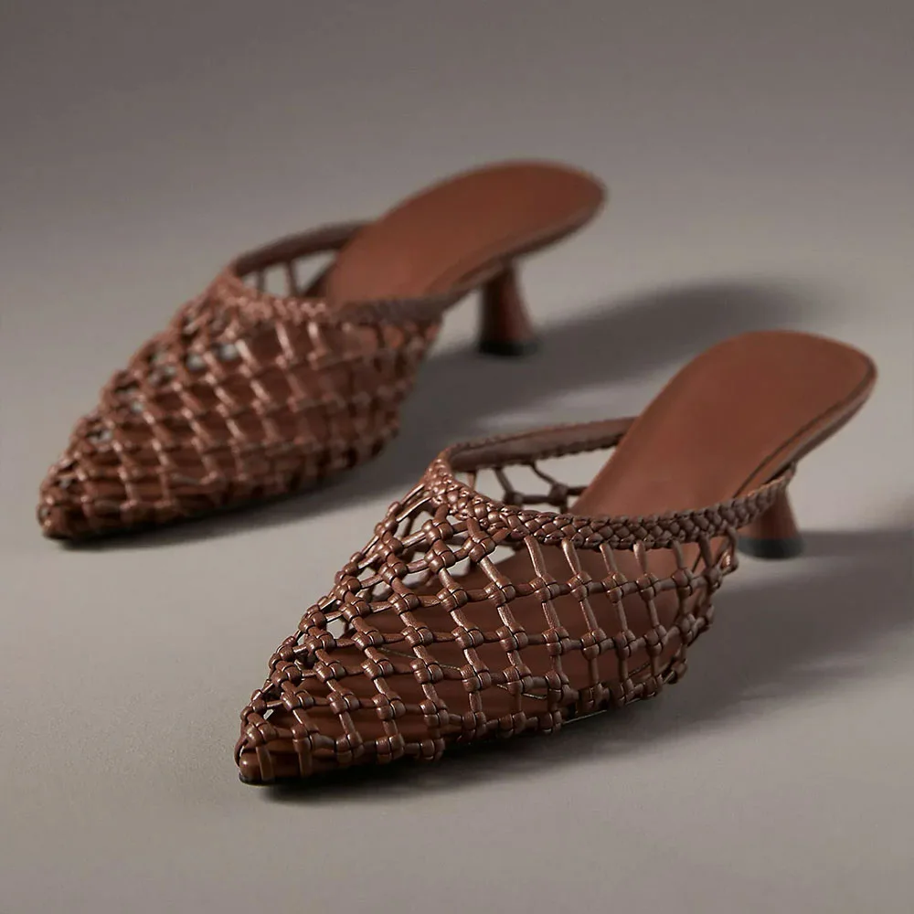 Brown Pointed Toe Braided Knotted Flared Heel Mules for Women