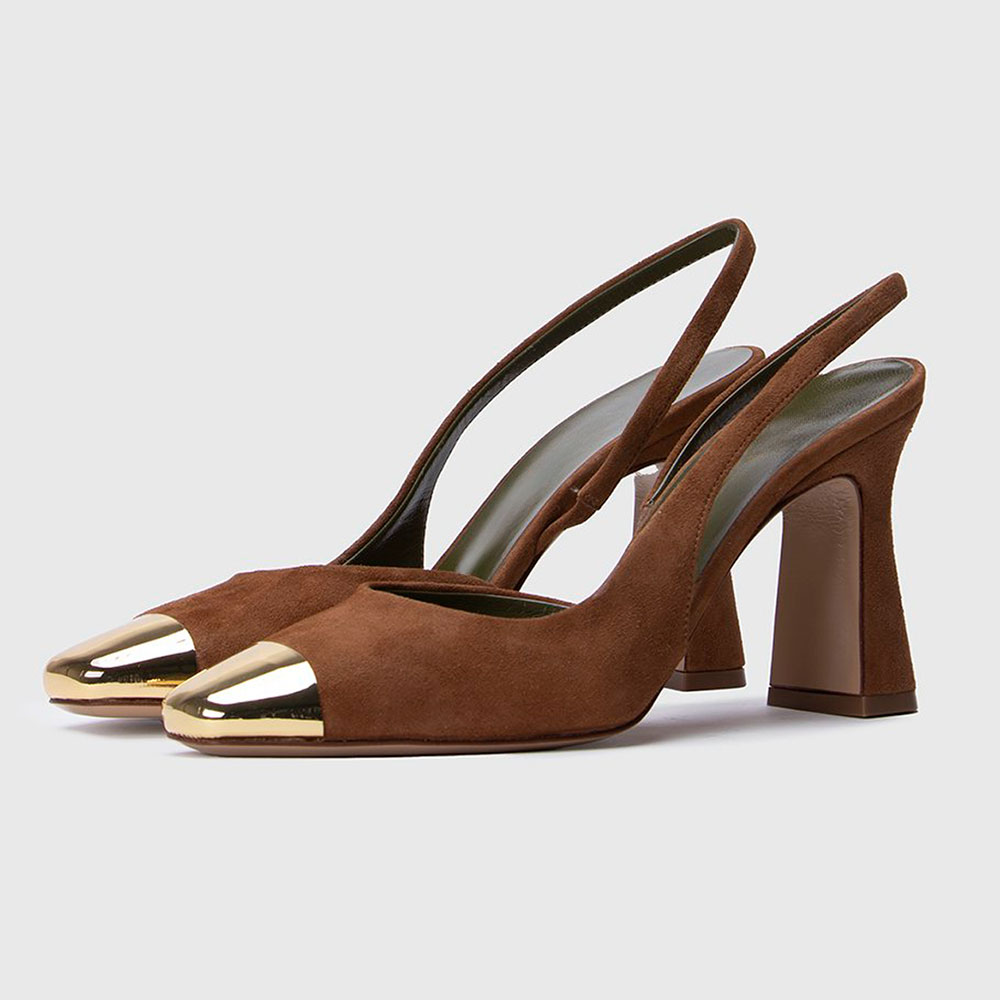 • Special Designs: The slingback shoes feature a metal cap square toe and chunky high heels.