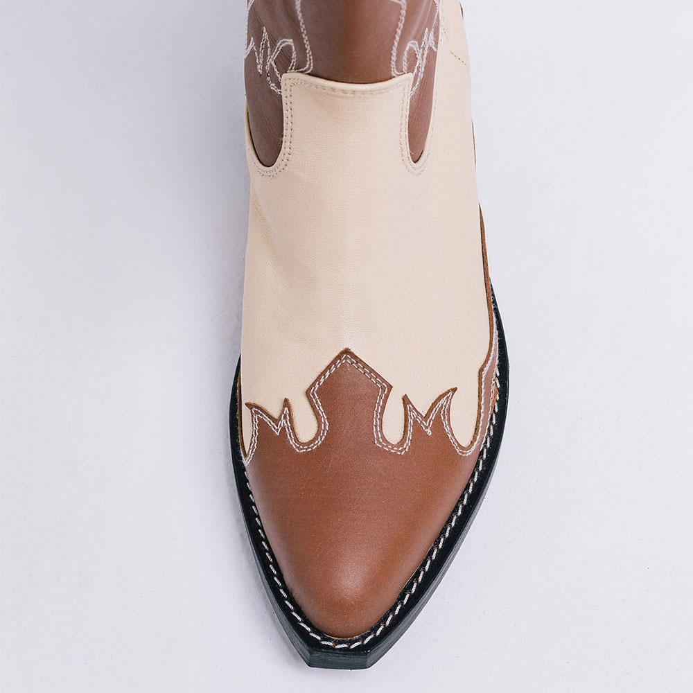 Brown & Ivory Chunky Heel Patchwork Cowgirl Boots with Embroidery