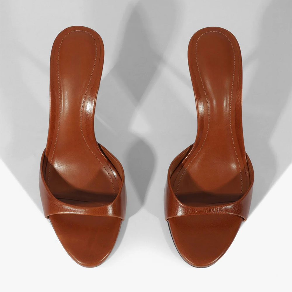 Special Designs: These brown mules feature an open round toe, a stiletto heel, and slip on very easily.