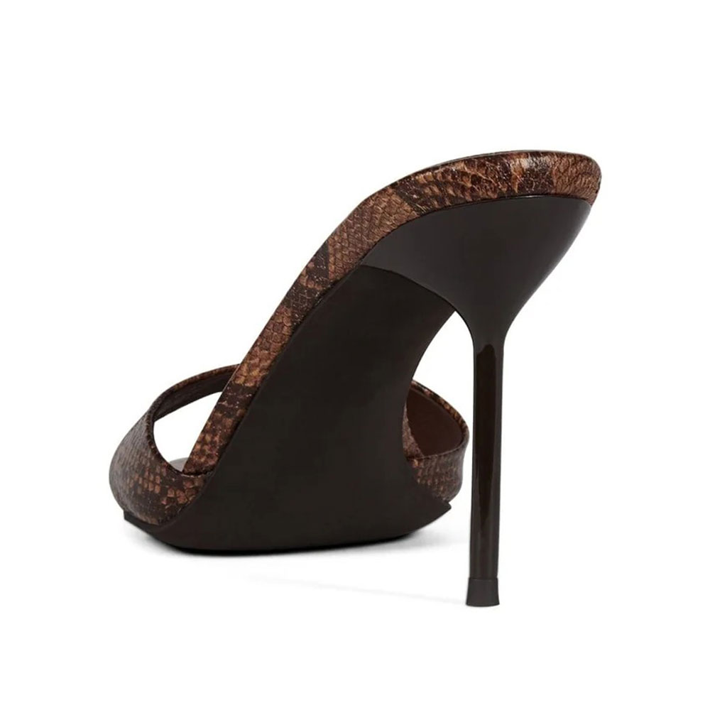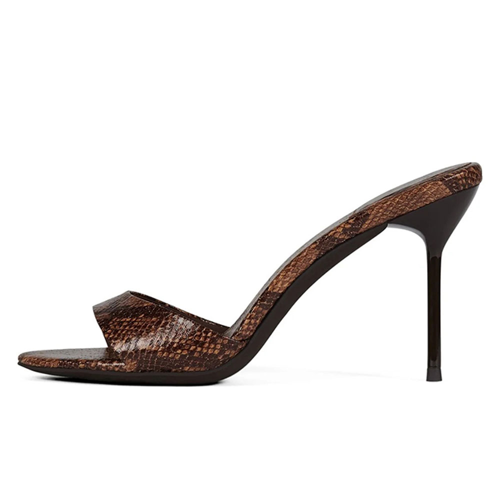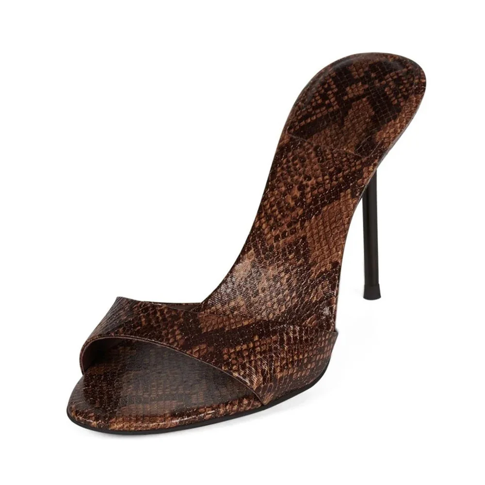 Brown Open Round Toe Stiletto Heel Mule Shoes for Women with Python