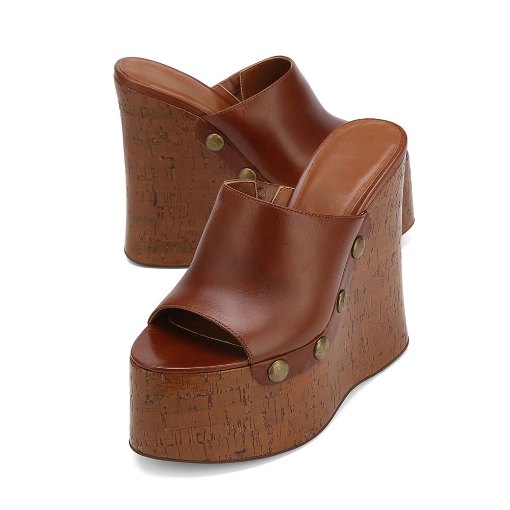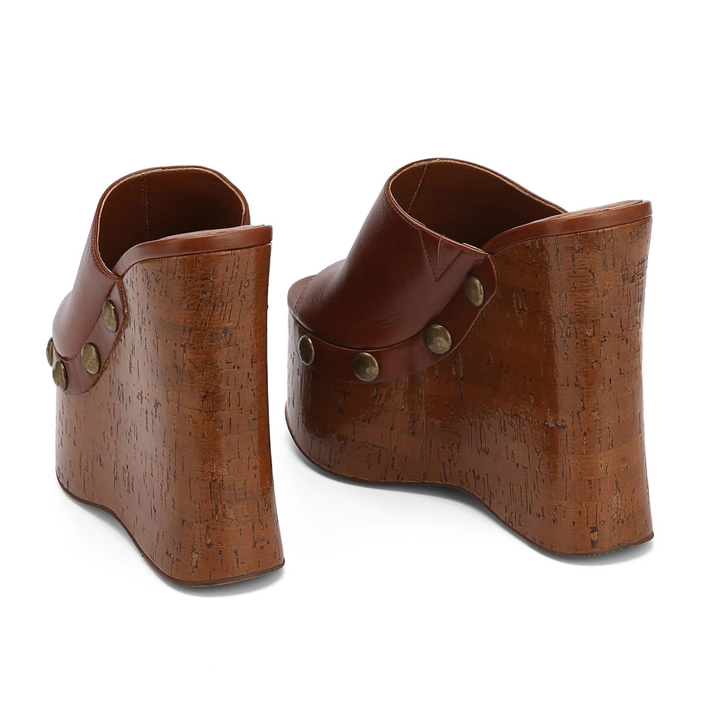 Brown Open Toe Studded Platform Wedge High Heel Mule Shoes for Women