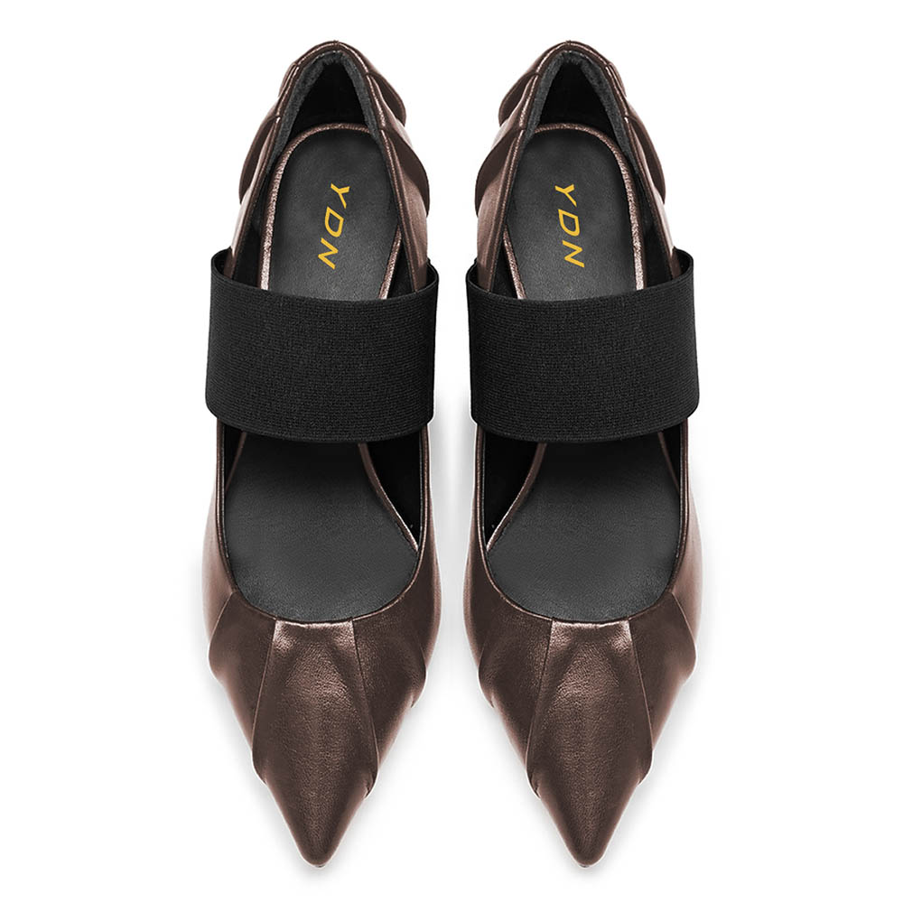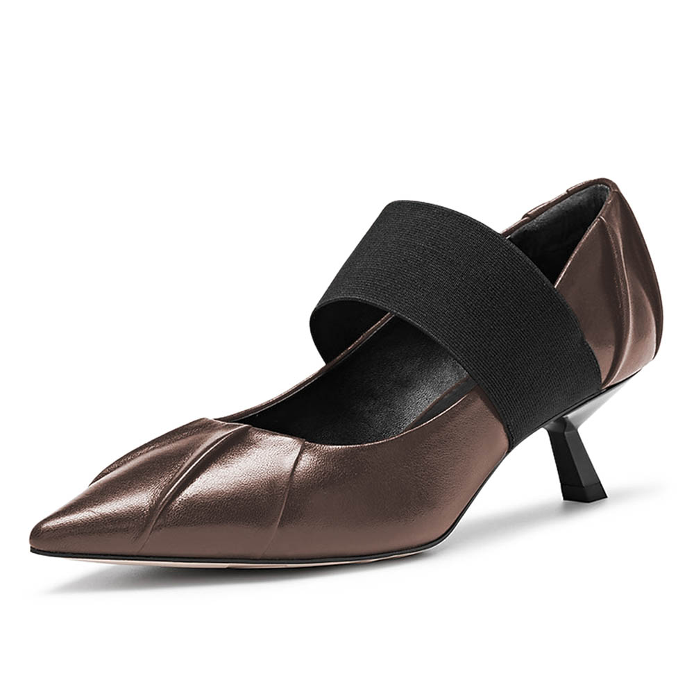 Brown Pleated Pointed Toe Elastic Band Kitten Heel Pumps for Women