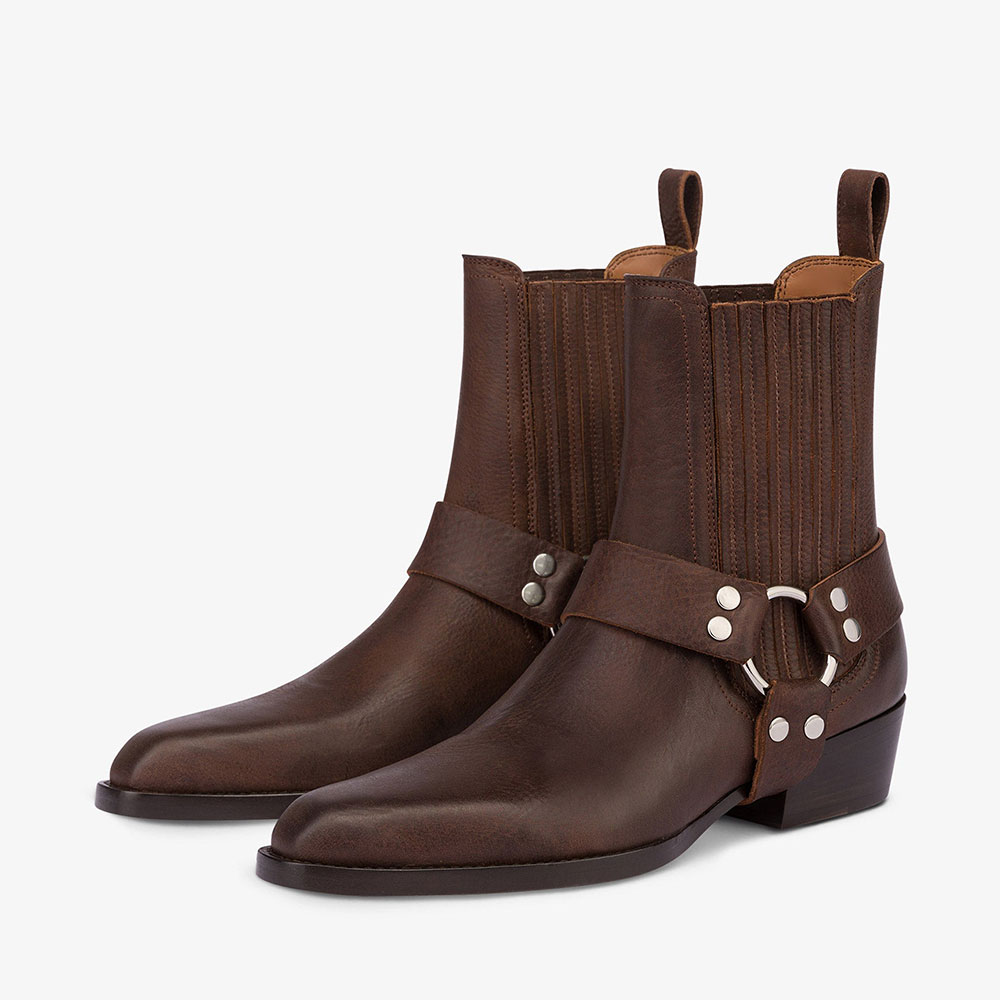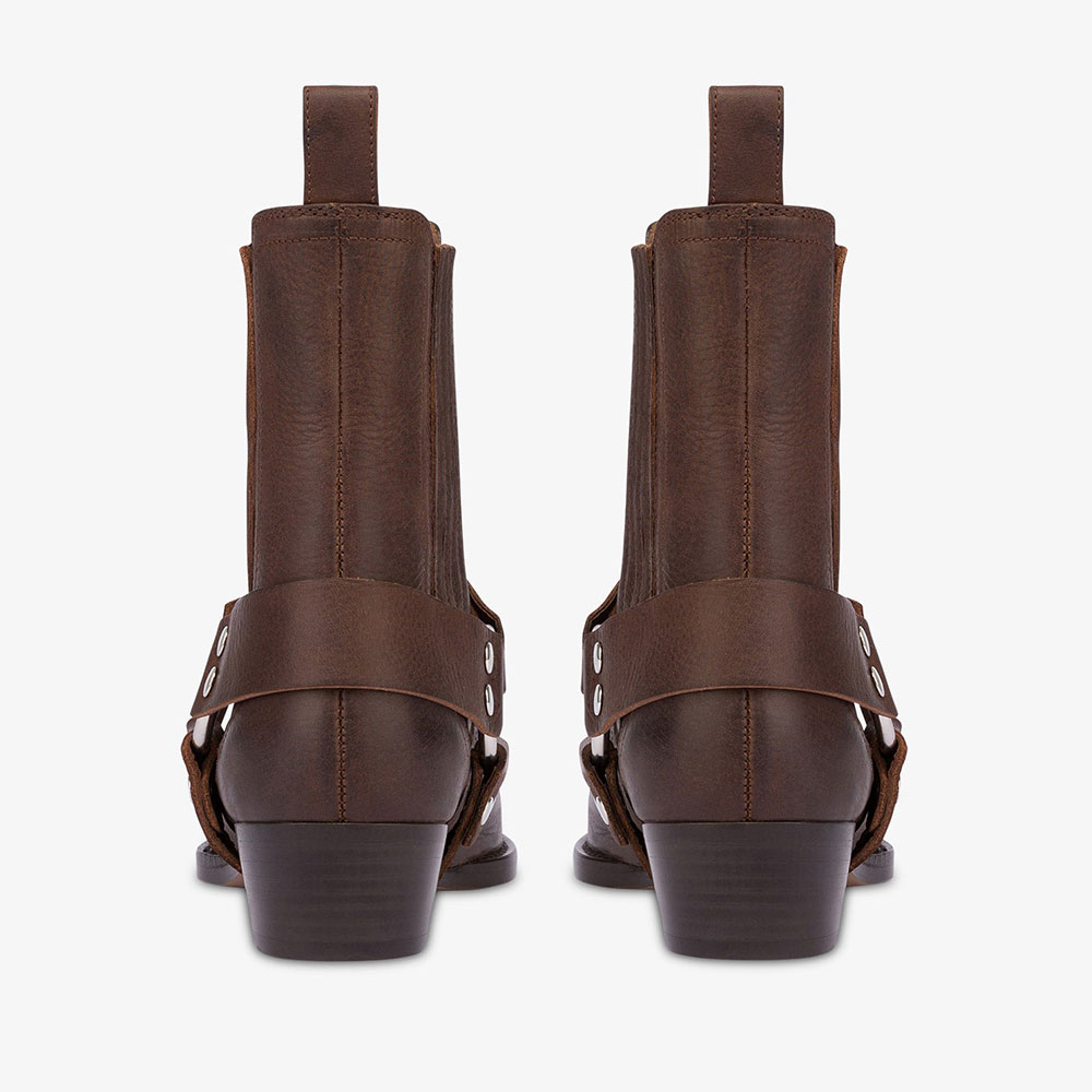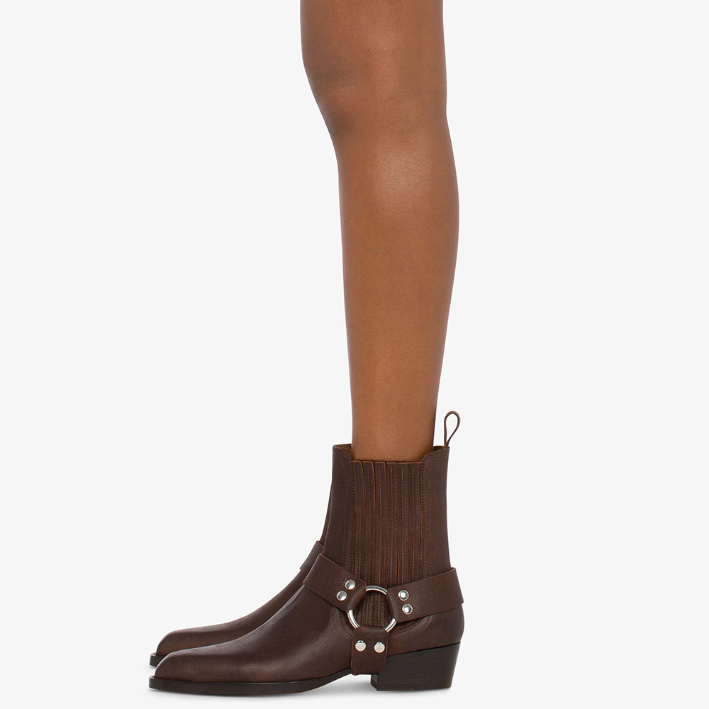 Brown Pointed Toe Chunky Heel Pull-On Ring Buckle Ankle Boots