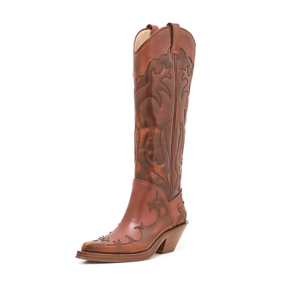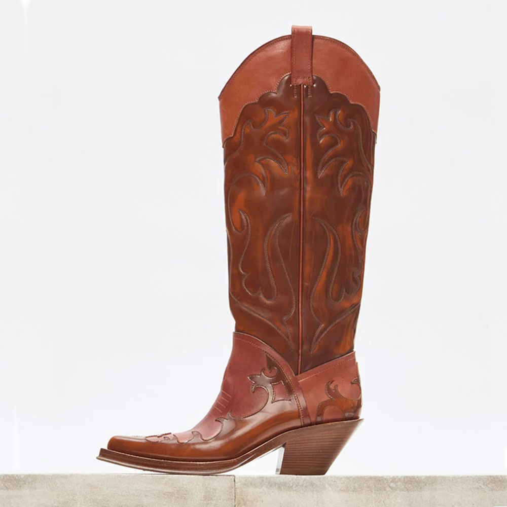 Special Designs: The cowgirl boots feature a pointed toe and chunky heel, accented with stitching detail.