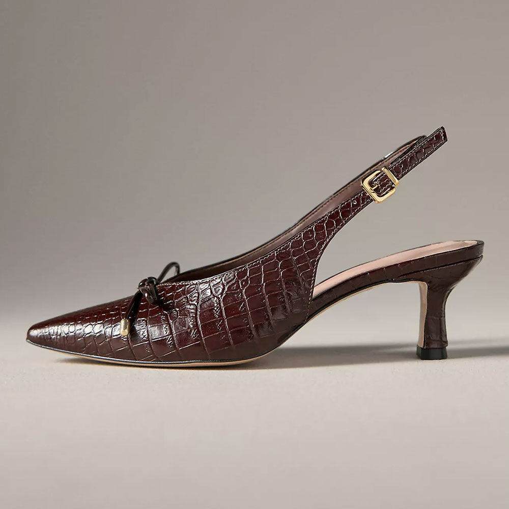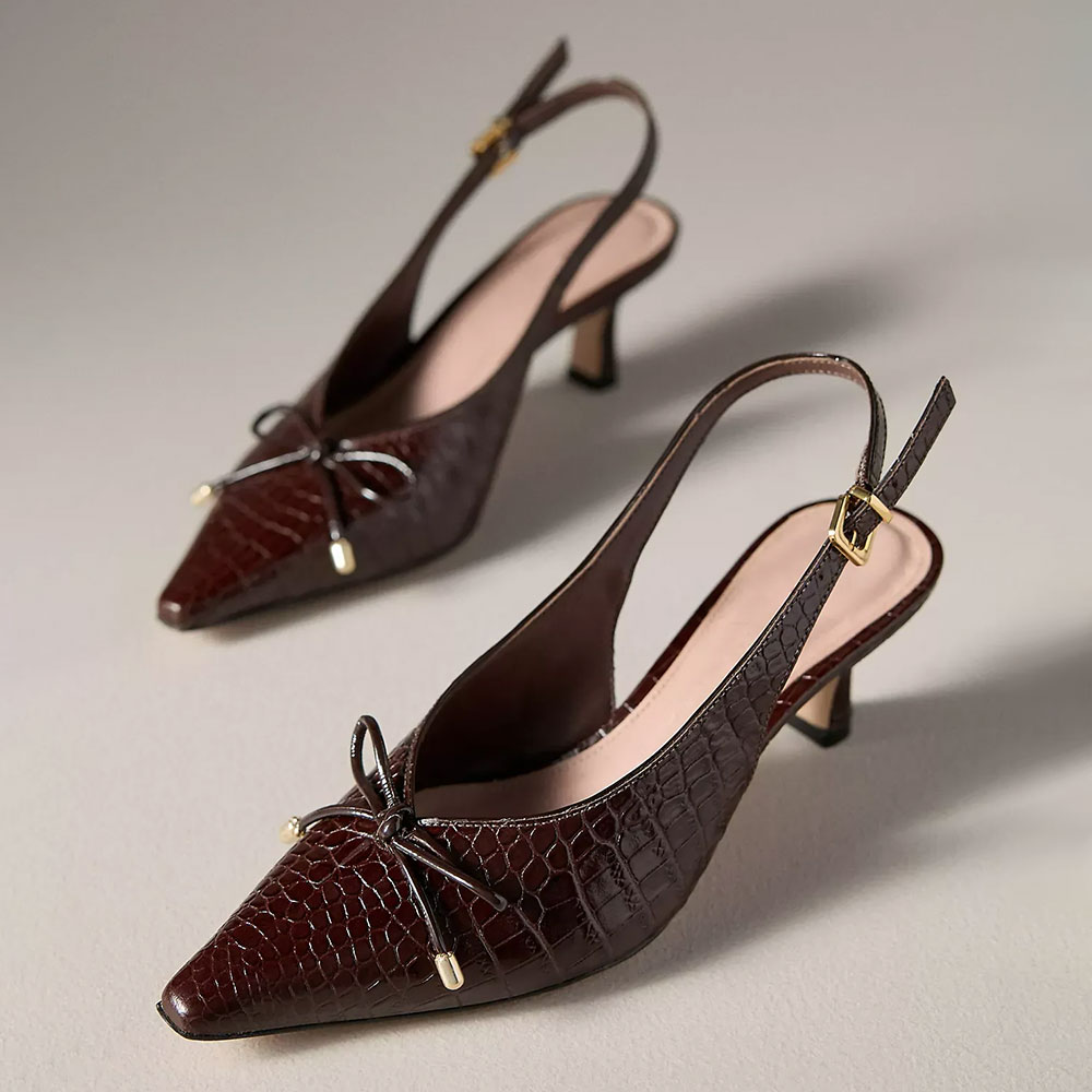Special Designs: The brown croc-embossed slingback pumps feature a pointed toe, a delicate bow detail, an adjustable slingback strap, and a stiletto heel.