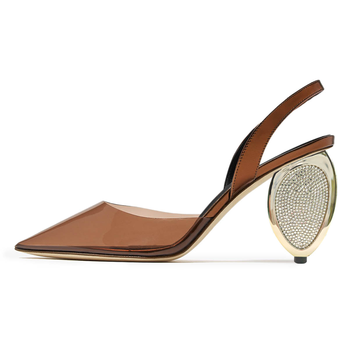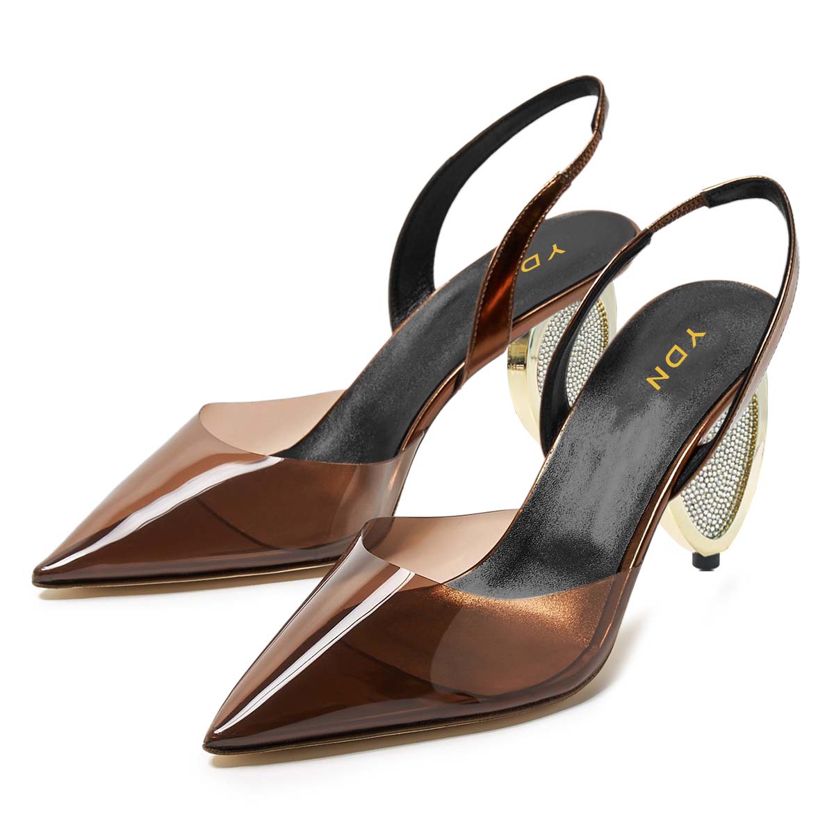Brown Pointed Toe Slingback Rhinestone Decorative Heel Clear Pumps