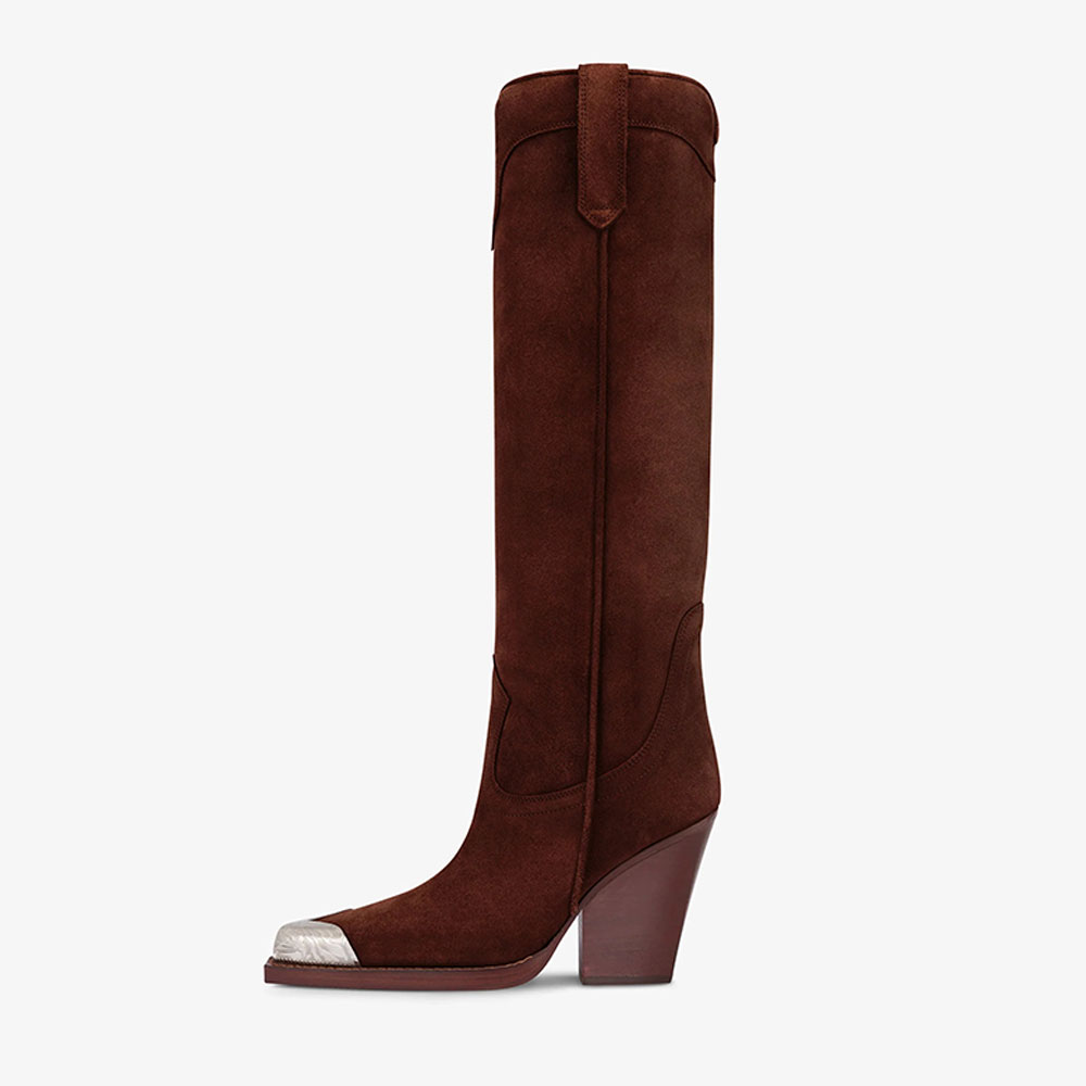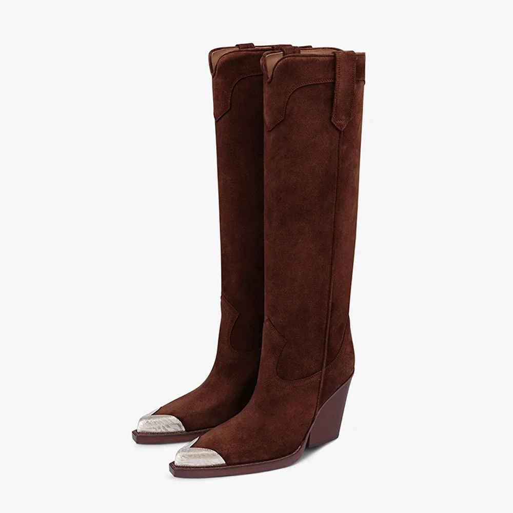 Brown Pointed Toe Stitching Knee High Western Boots for Women