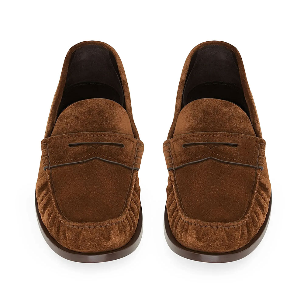 Special Designs: The brown vegan suede loafers feature a classic penny loafer design with ruched detailing at the toe, a flat sole.