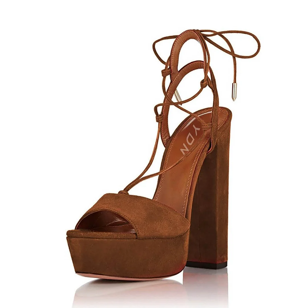 Brown Round Toe Platform Chunky High Heel Lace Up Summer Sandals