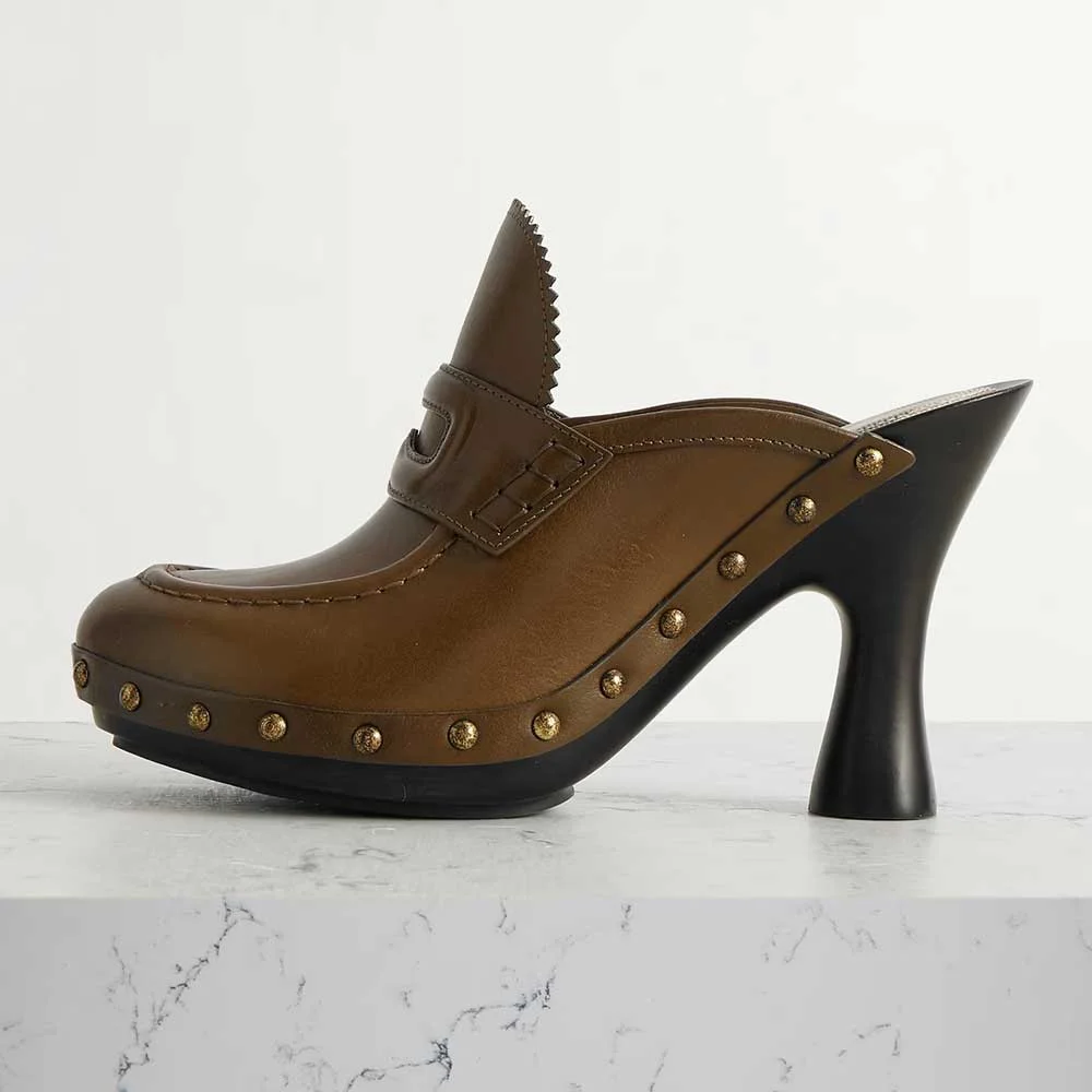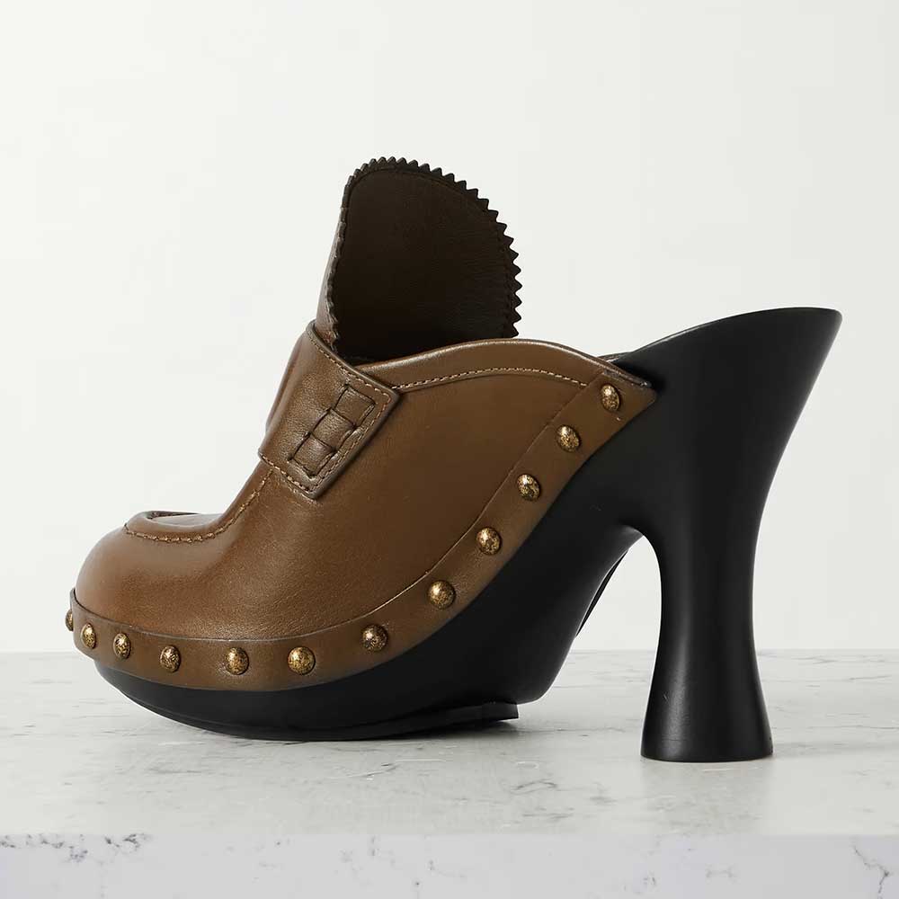 Brown Round Toe Studded Flared High Heel Mule Shoes for Women