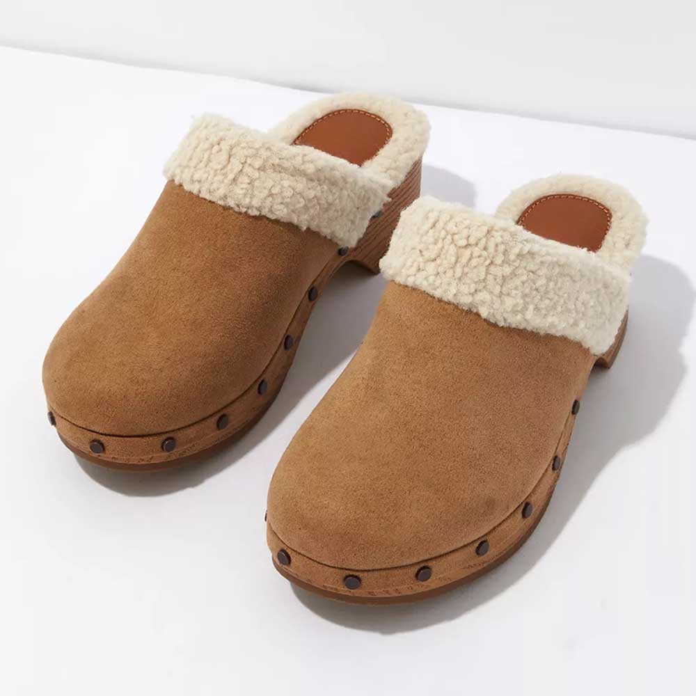 Brown Slip-On Faux Fur Round Toe Block Heel Platform Mules with Studs