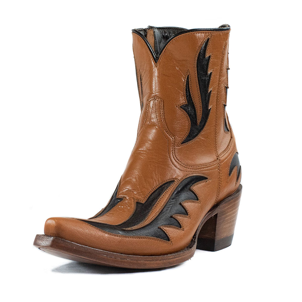 Brown Snip Toe Black Inlay Stacked Heel Zipper Short Cowgirl Boots