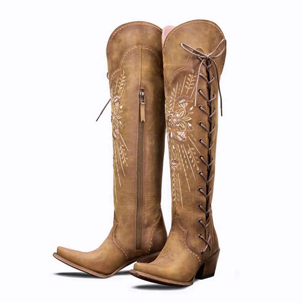 • Special Designs: The over-the-knee cowgirl boots feature a lace-up and side zipper design, with flower embroidery.