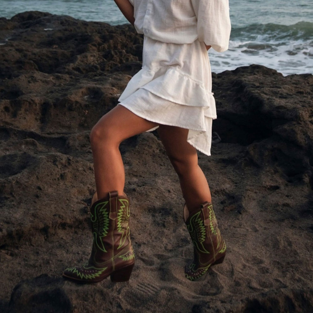 Special Designs: The snip-toe cowgirl boots feature stud embellishment and green delicate embroidery.