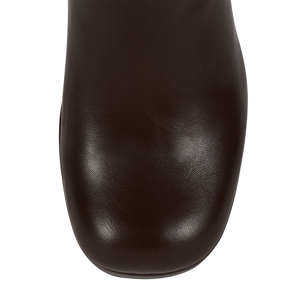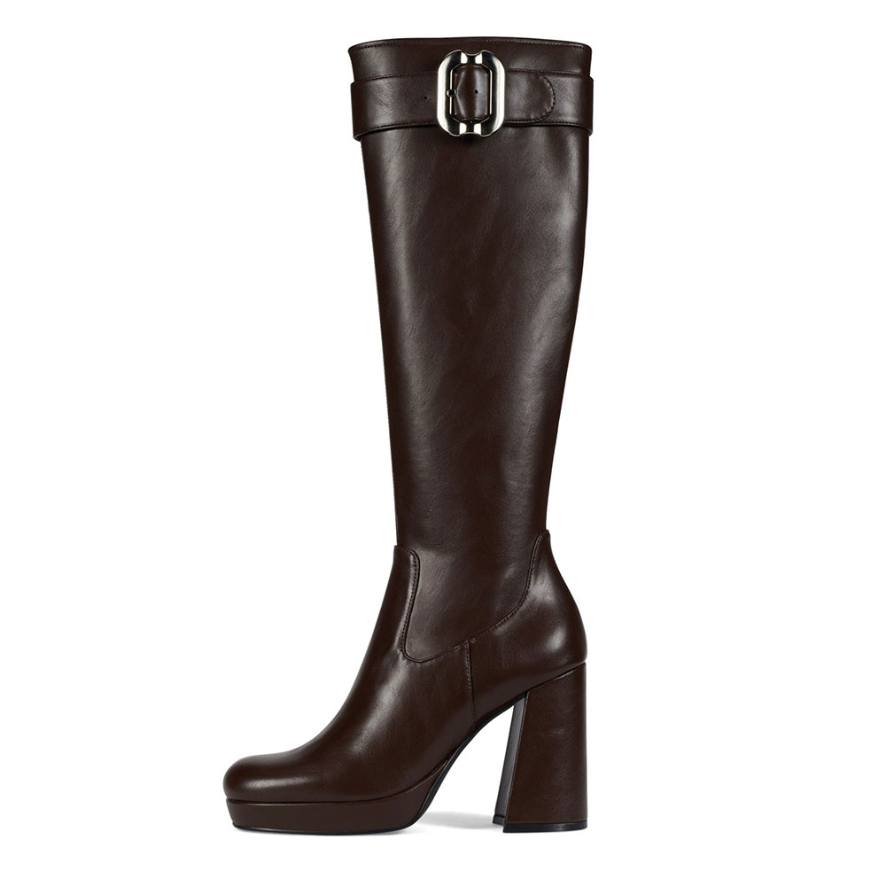 Brown Square Toe Chunky Heel Knee High Platform Boots with Buckle