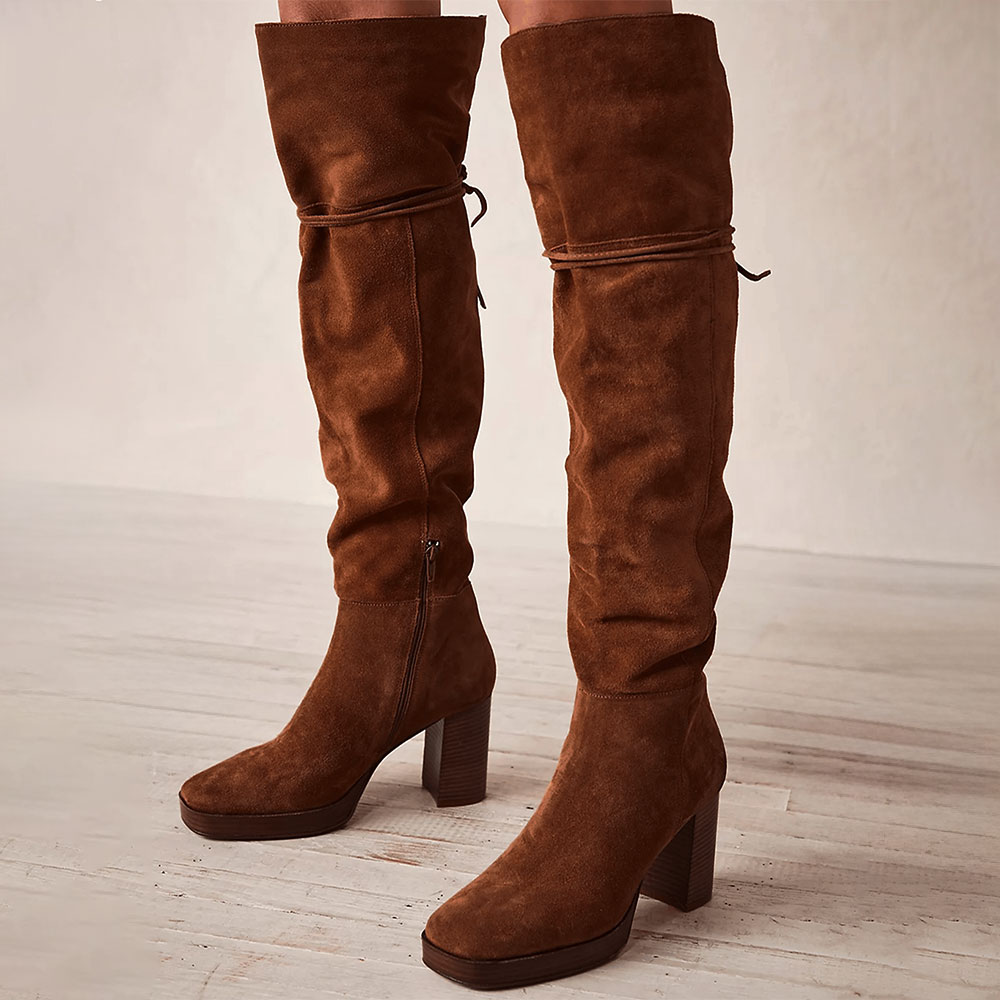 Brown Square Toe Chunky Heel Platform Over the Knee Boots with Zipper