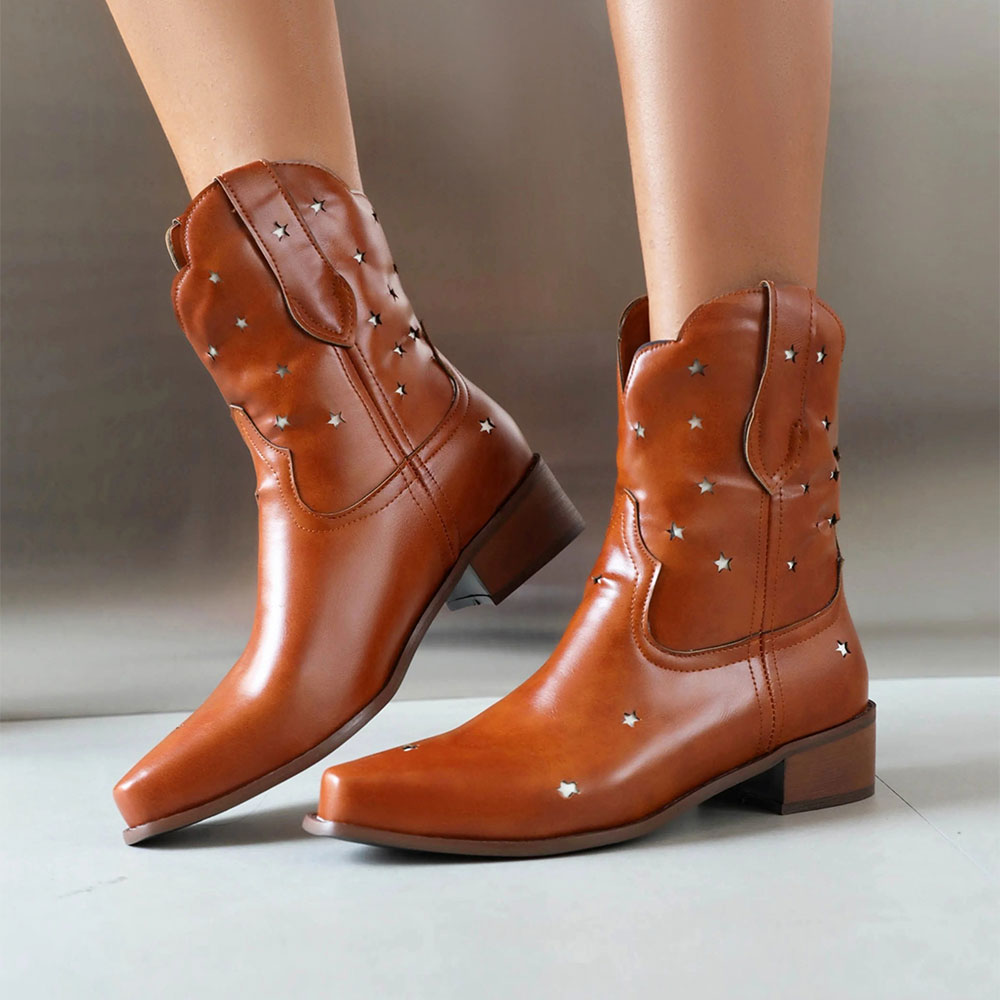 Brown Square Toe Chunky Heel Pull On Star Hollow-Out Cowgirl Boots