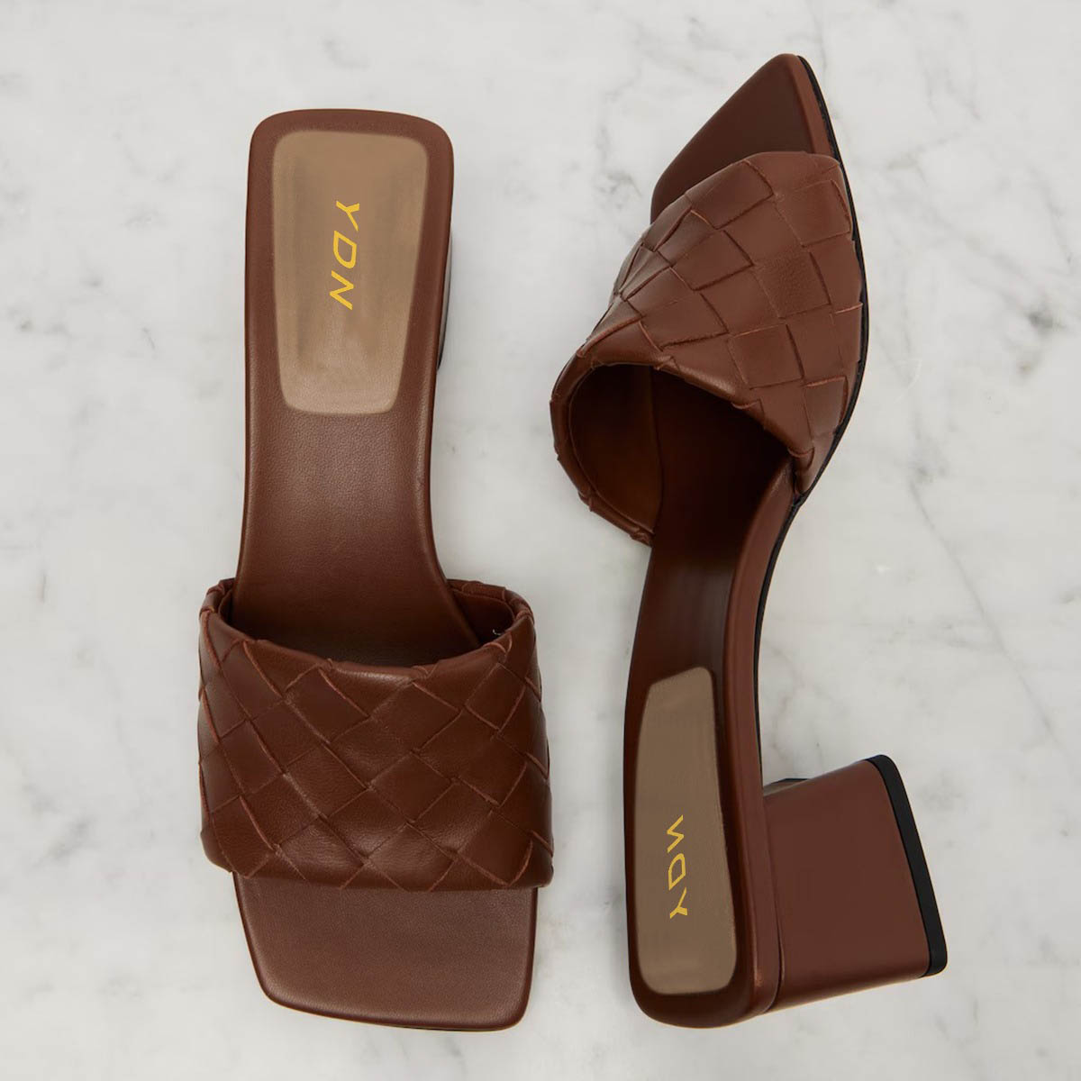 • Special Designs: These brown mules feature a woven upper, a square toe, and a chunky heel.