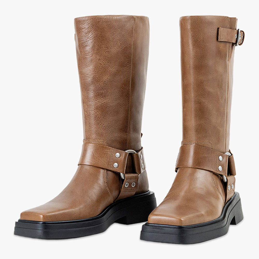 • Special Designs: The mid calf boots feature studded buckle strap design with a square toe and low heel.