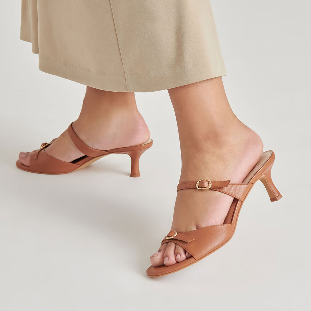 Special Designs: The open-toe kitten-heel slide shoes feature a double buckle design.
