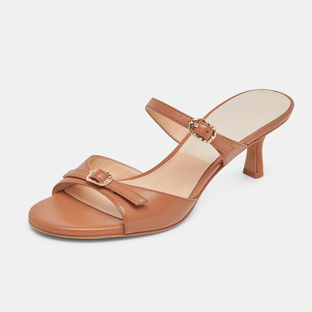 Brown Vegan Leather Buckle Kitten Heel Open-Toe Slide Shoes for Women