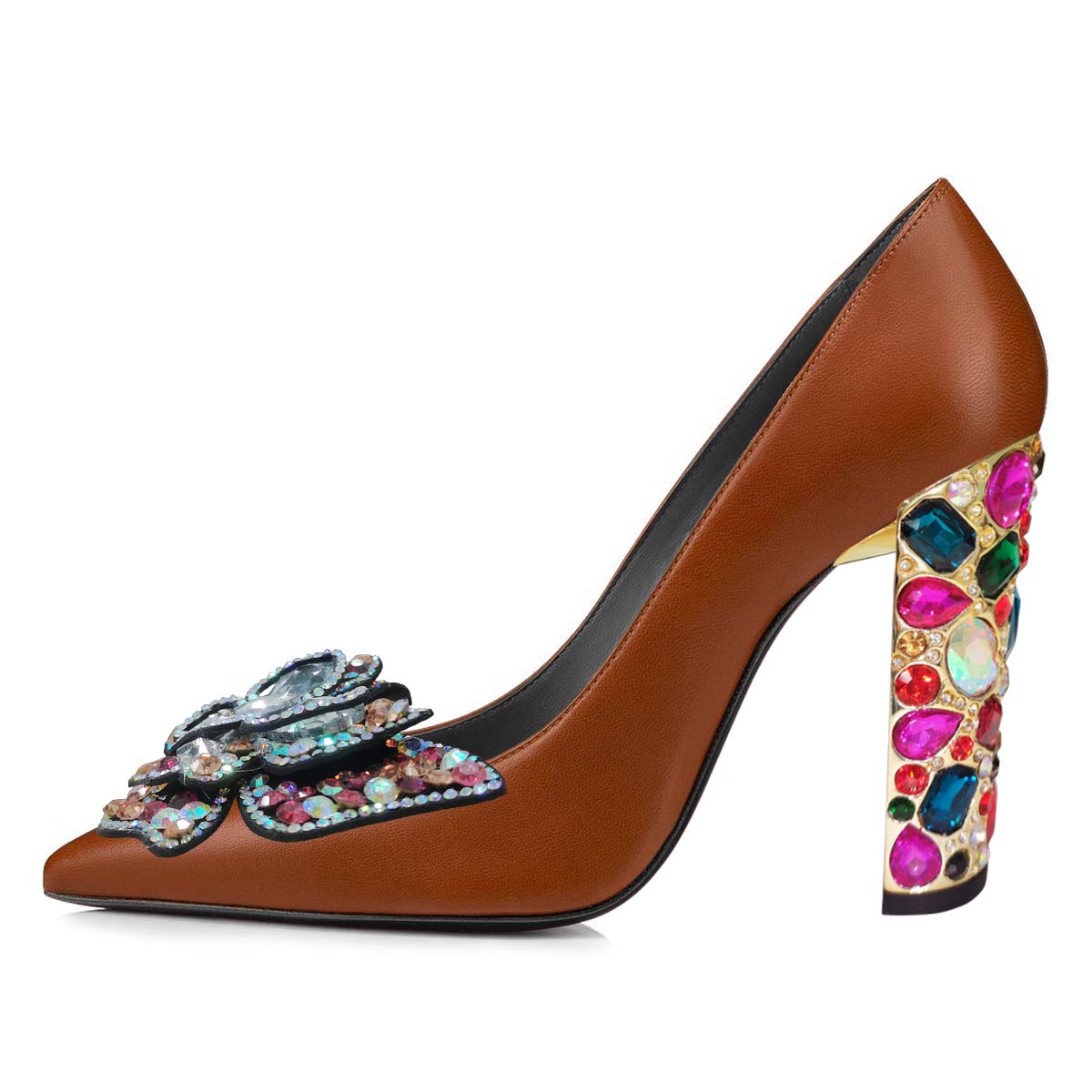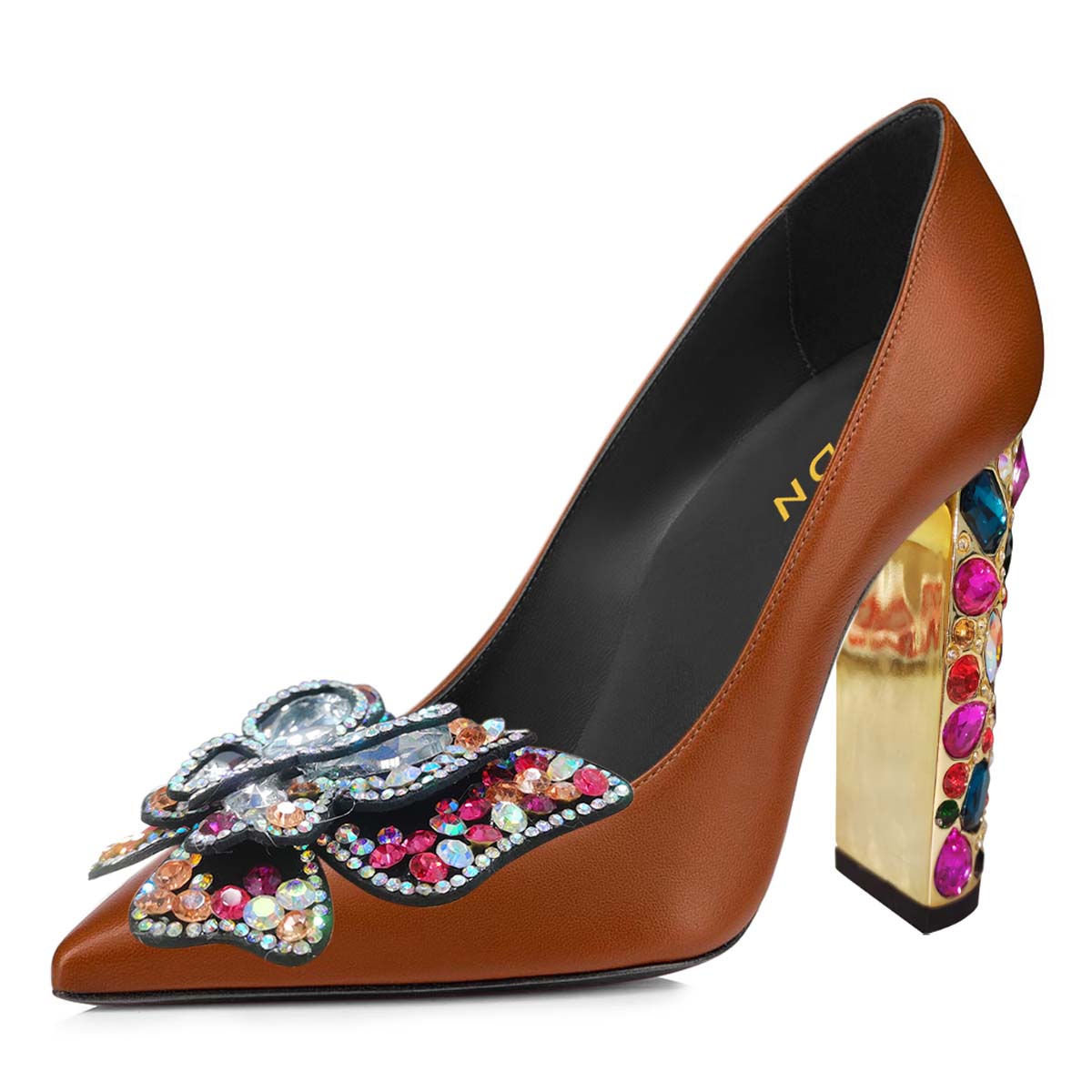 • Special Designs: The pointed-toe pump shoes feature sparkly rhinestone-decorated butterflies and chunky heels.