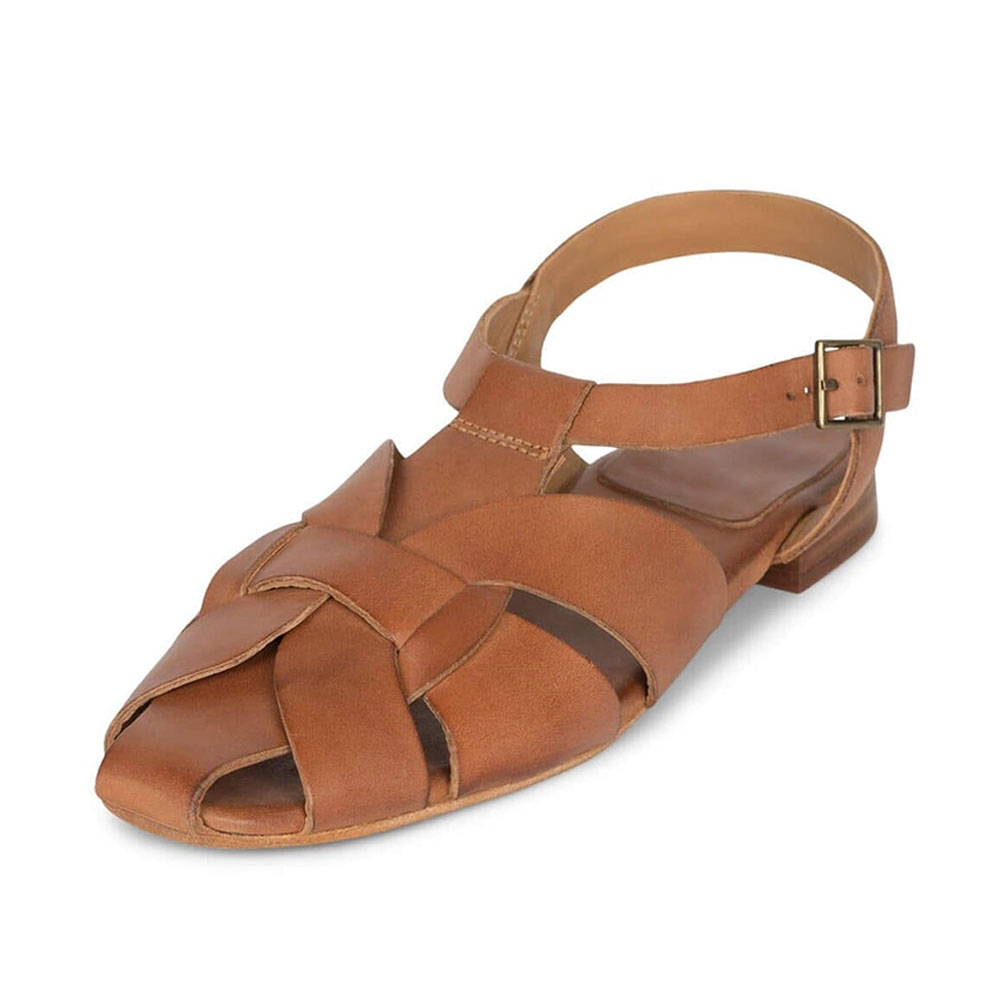 Brown Vegan Leather Woven Detail Round Toe Flat Women's Sandals
