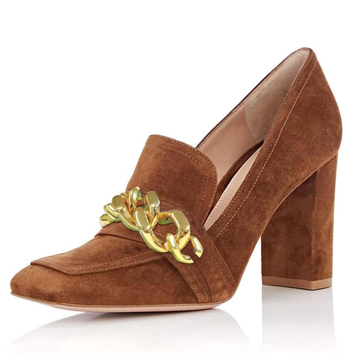 Brown Vegan Suede Chain Chunky Heeled Loafers with Square Toe