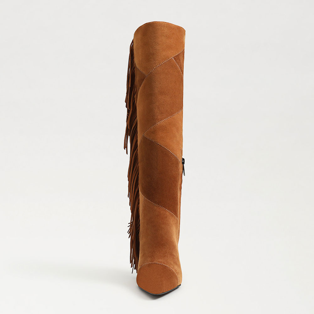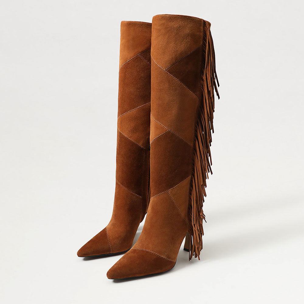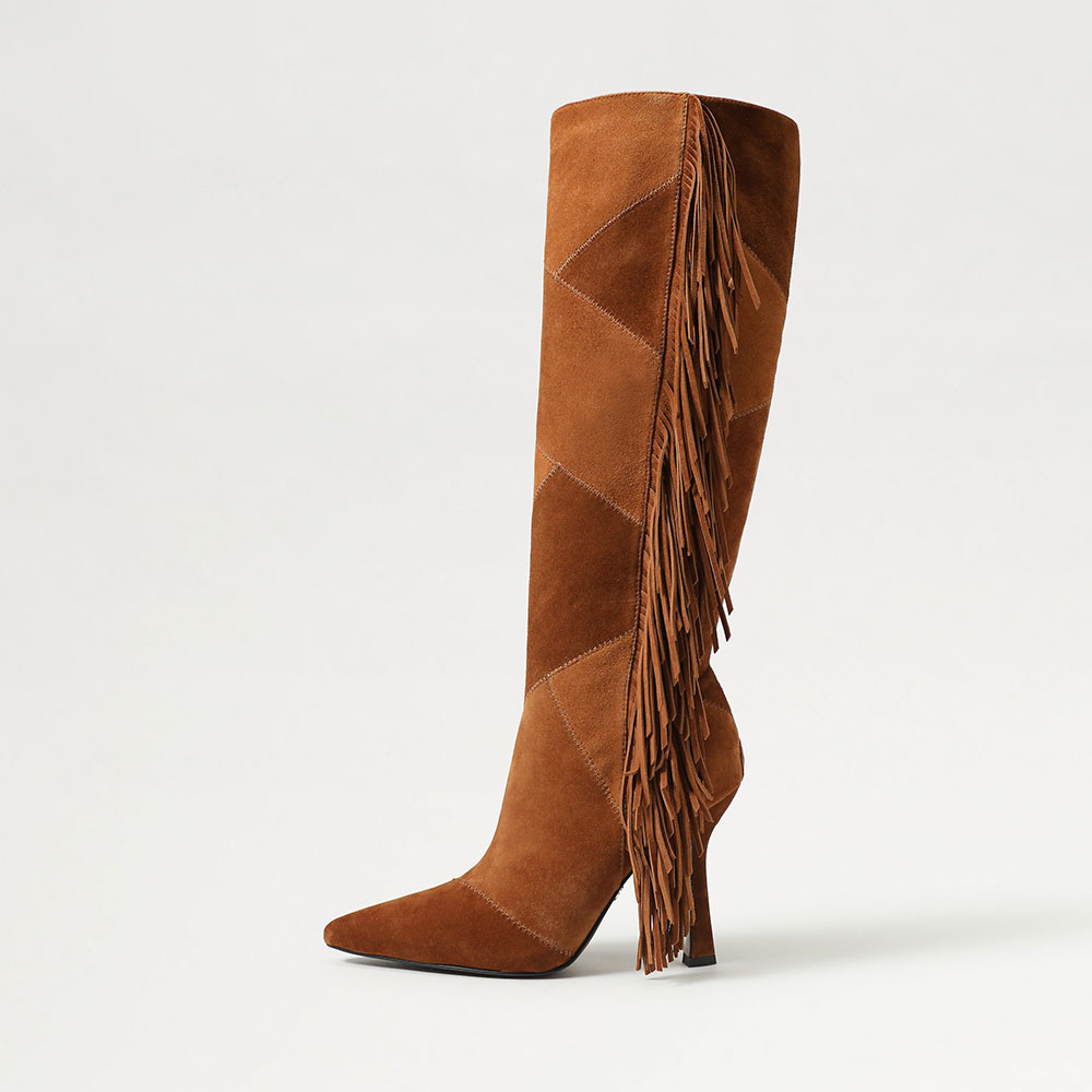 Brown Vegan Suede Patchwork Flared Heel Side Fringe Knee High Boots
