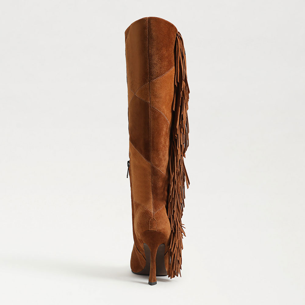 Special Designs: The pointed-toe knee-high boots feature side fringe and a half-zipper design.